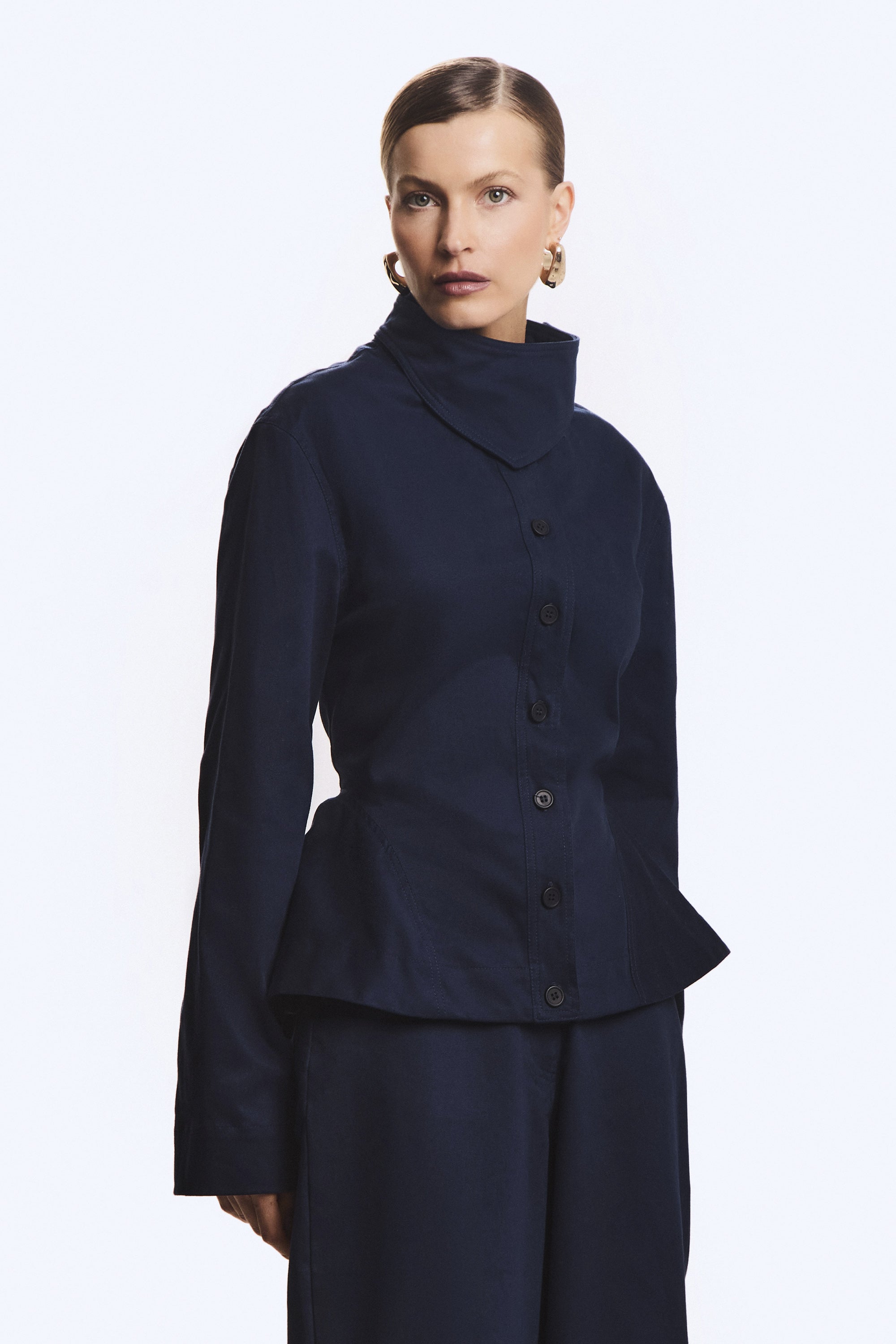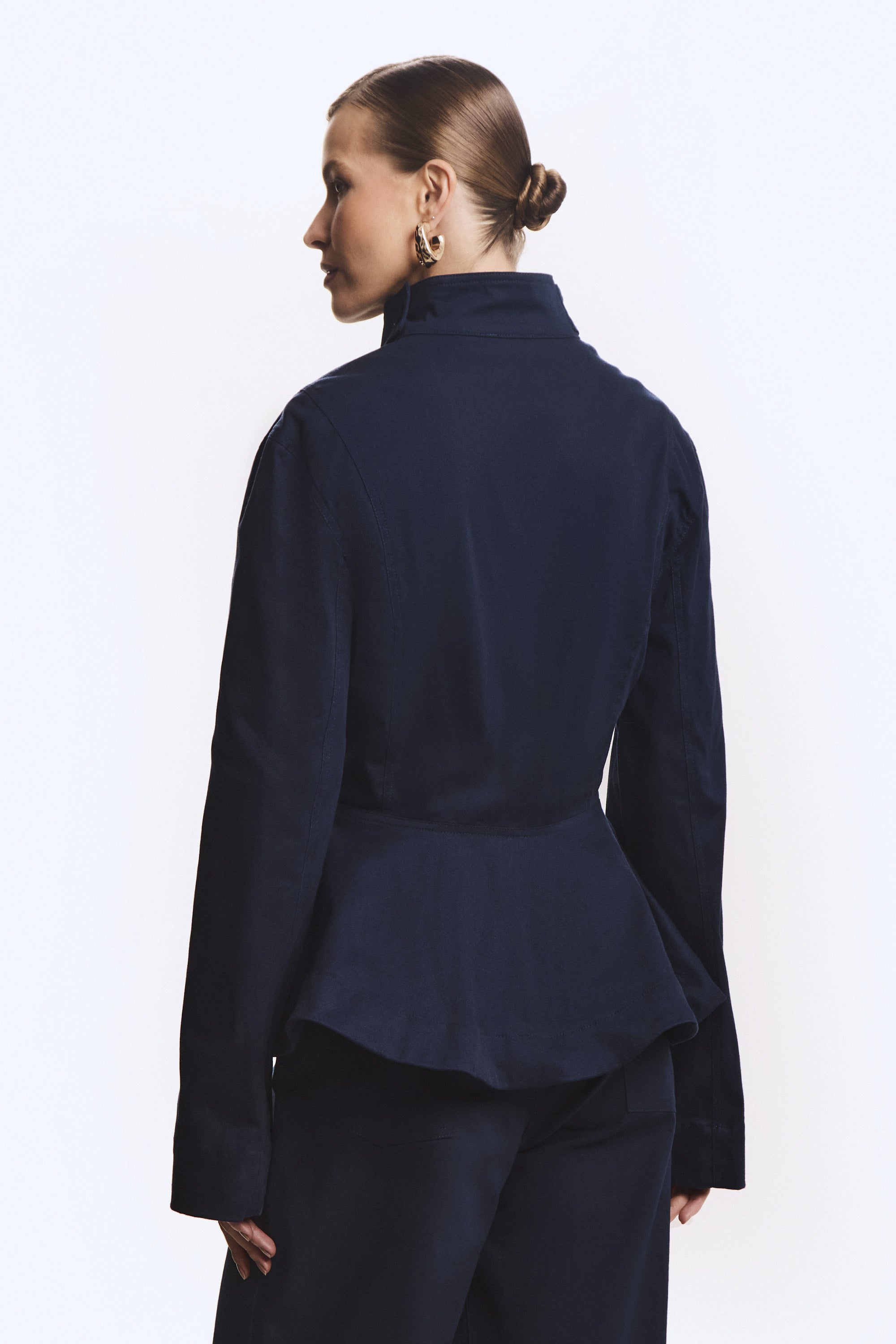 CASACO CURTO SOBREPOSICAO GOLA ACINTURADO BARRA AMPLA AZUL MARINHO ESCURO