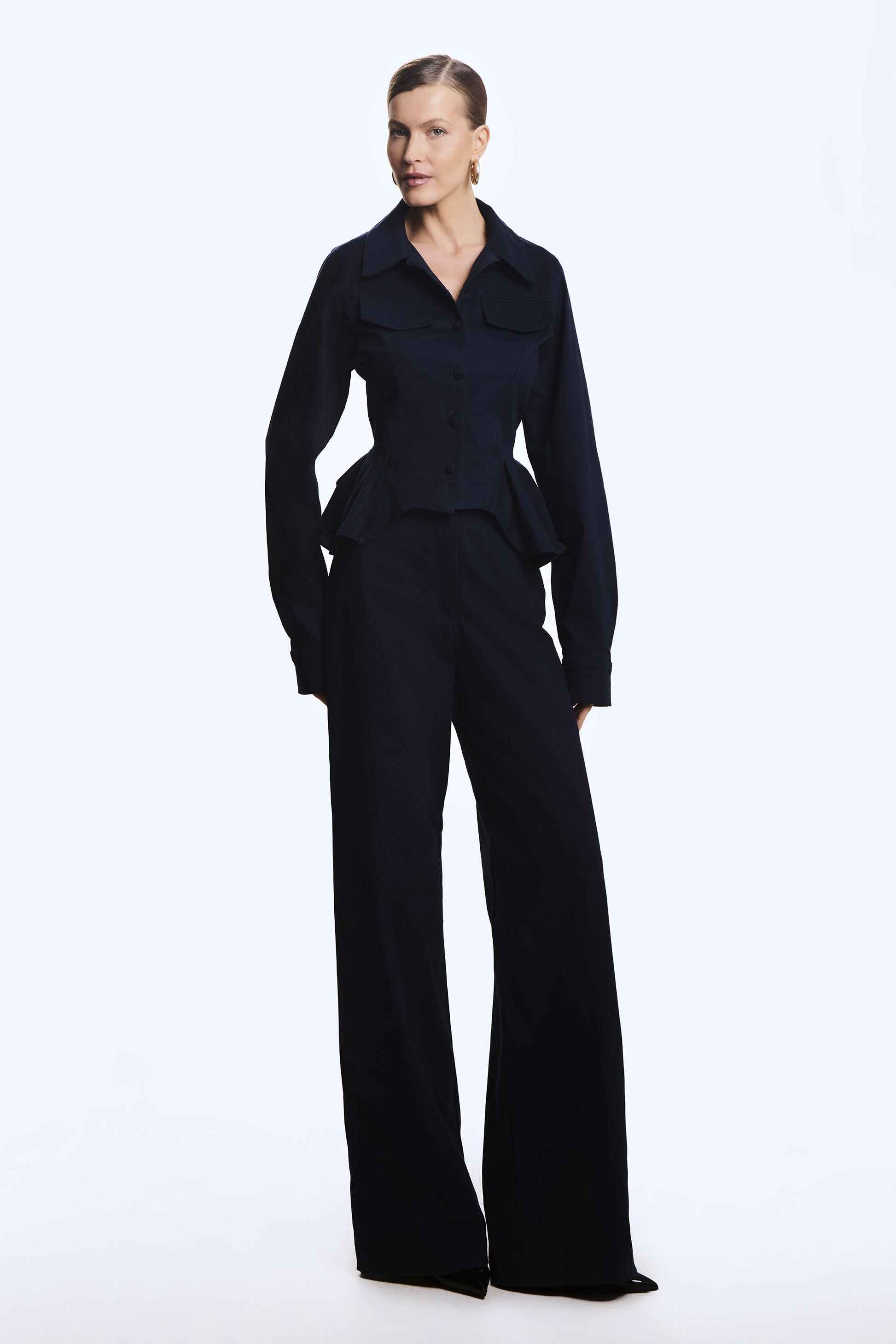BLUSA MANGA LONGA ACINTURADA BARRA AMPLA BOLSOS FRENTE AZUL MARINHO