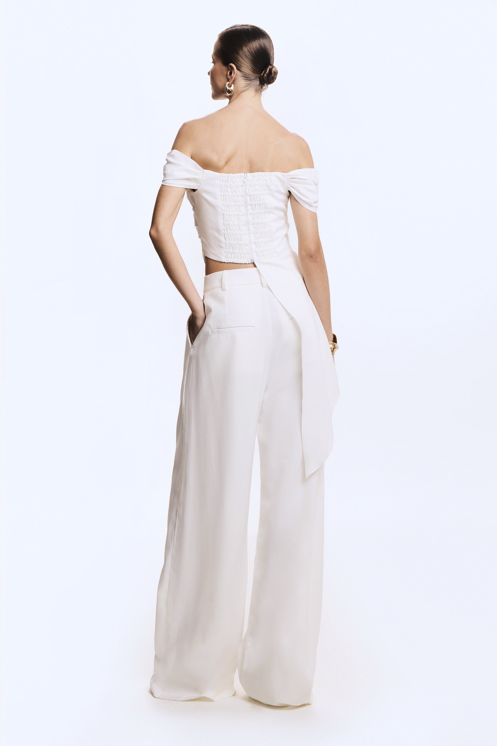 BLUSA OMBRO A OMBRO FLUIDA COM BARRA ASSIMETRICA E DRAPEADOS OFF WHITE