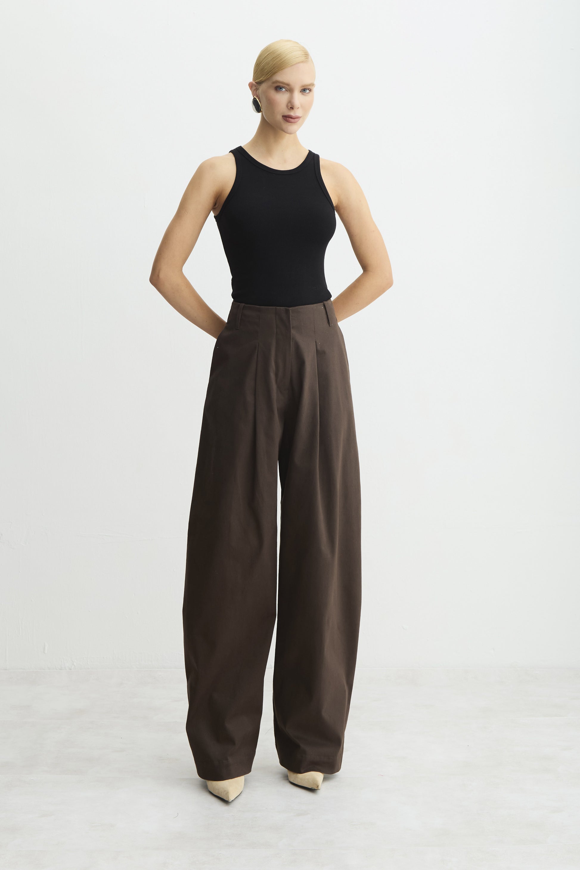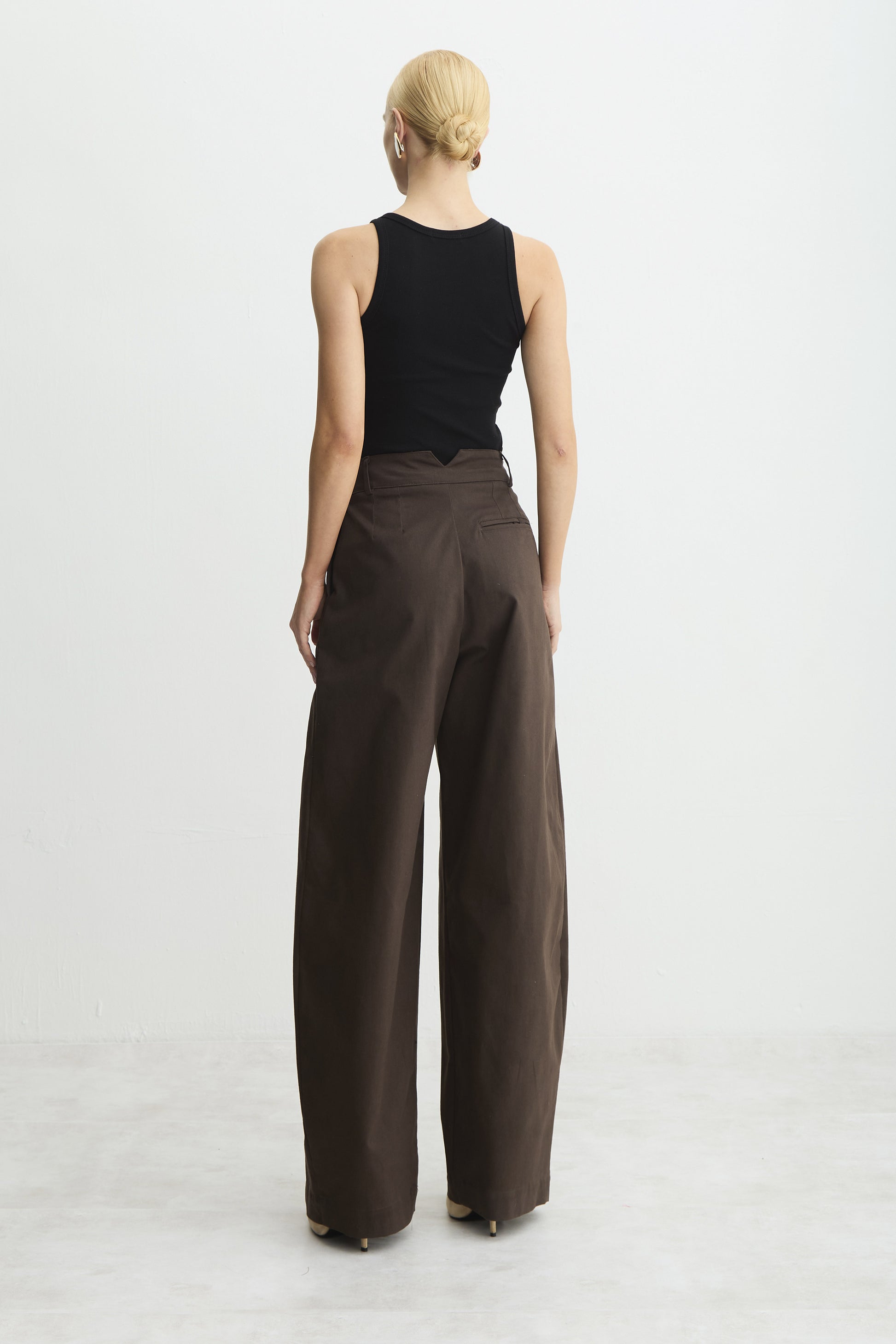 CALCA BAGGY PREGA FRONTAL RECORTE V COSTAS MARROM DARK