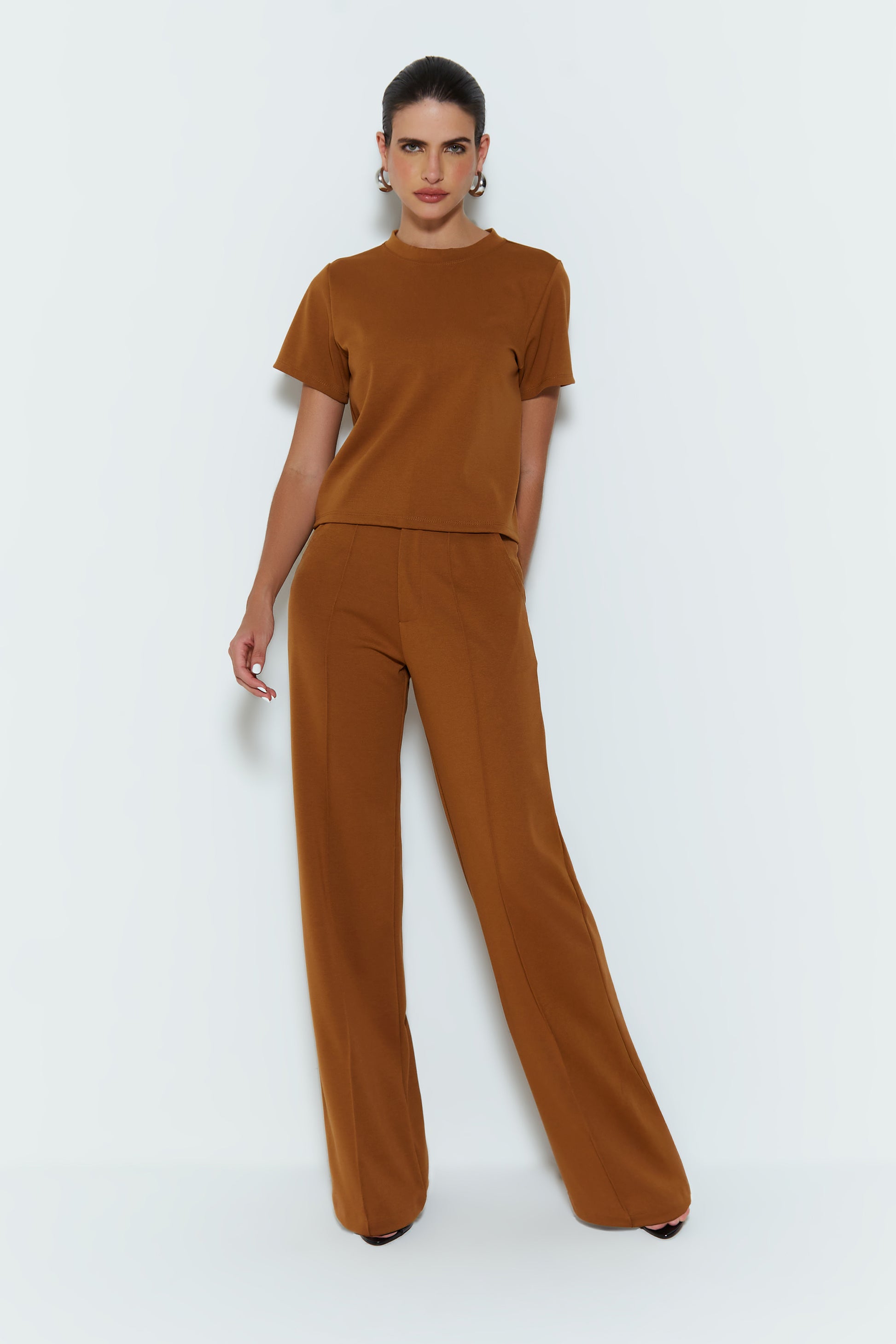 CALÇA PANTALONA COM FRISOS MARROM CHOCOLATE