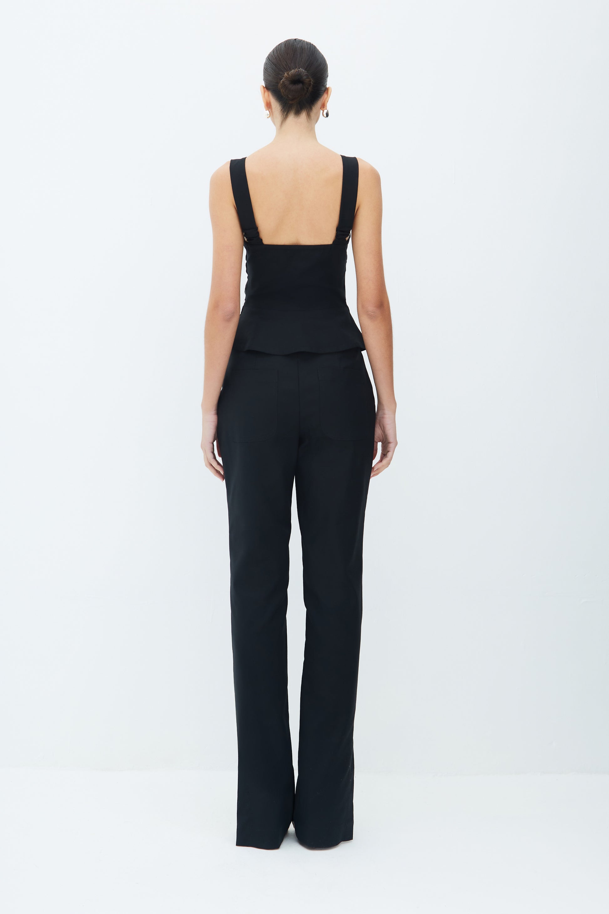 CALÇA RETA COM BOLSOS FRONTAL E ABERTURA NA BARRA PRETO