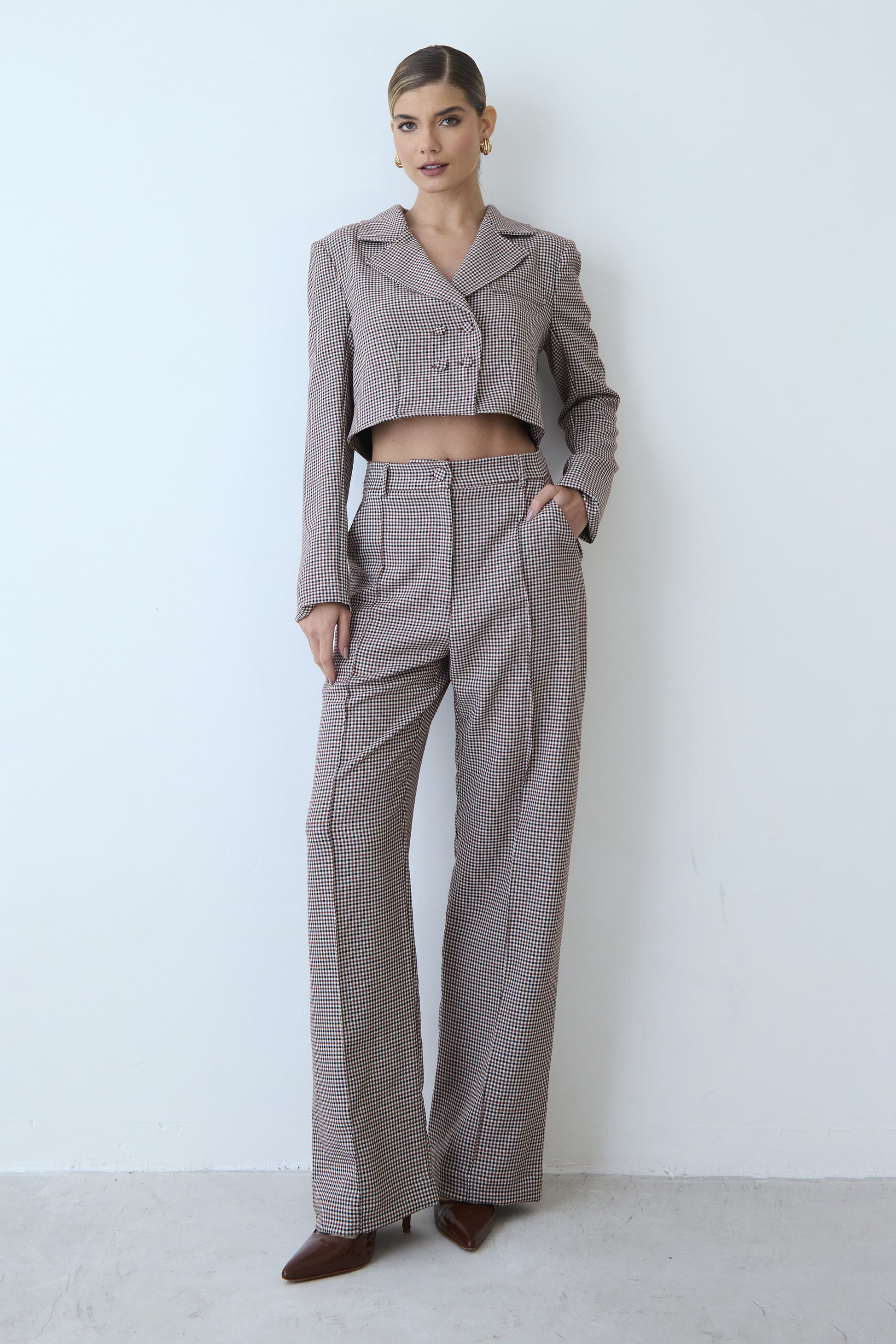CALCA RETA COM FRISO FRONTAL BOLSO COSTAS XADREZ MARROM