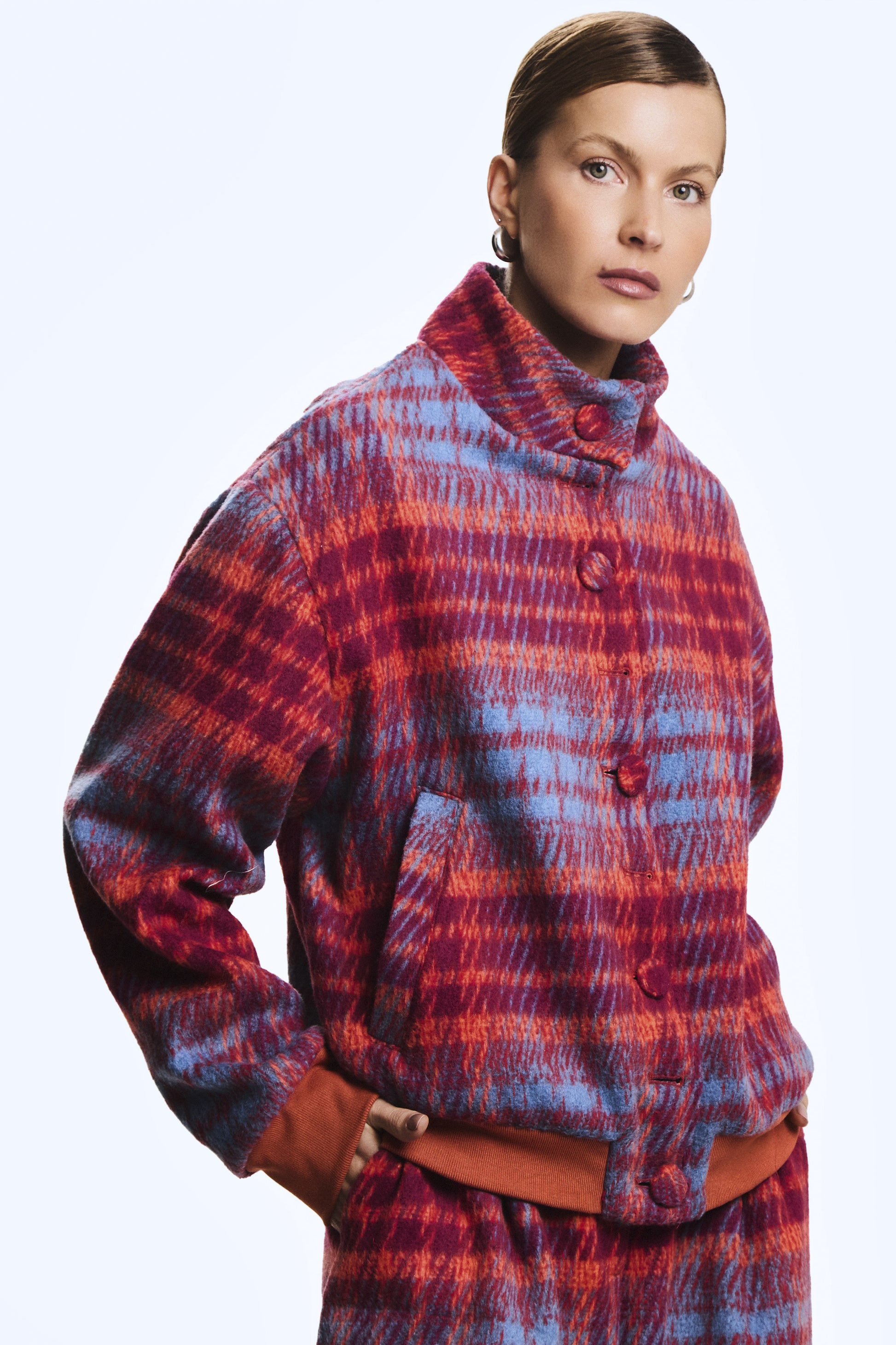 CASACO CURTO XADREZ COM GOLA E BOTOES FRONTAL VERMELHO