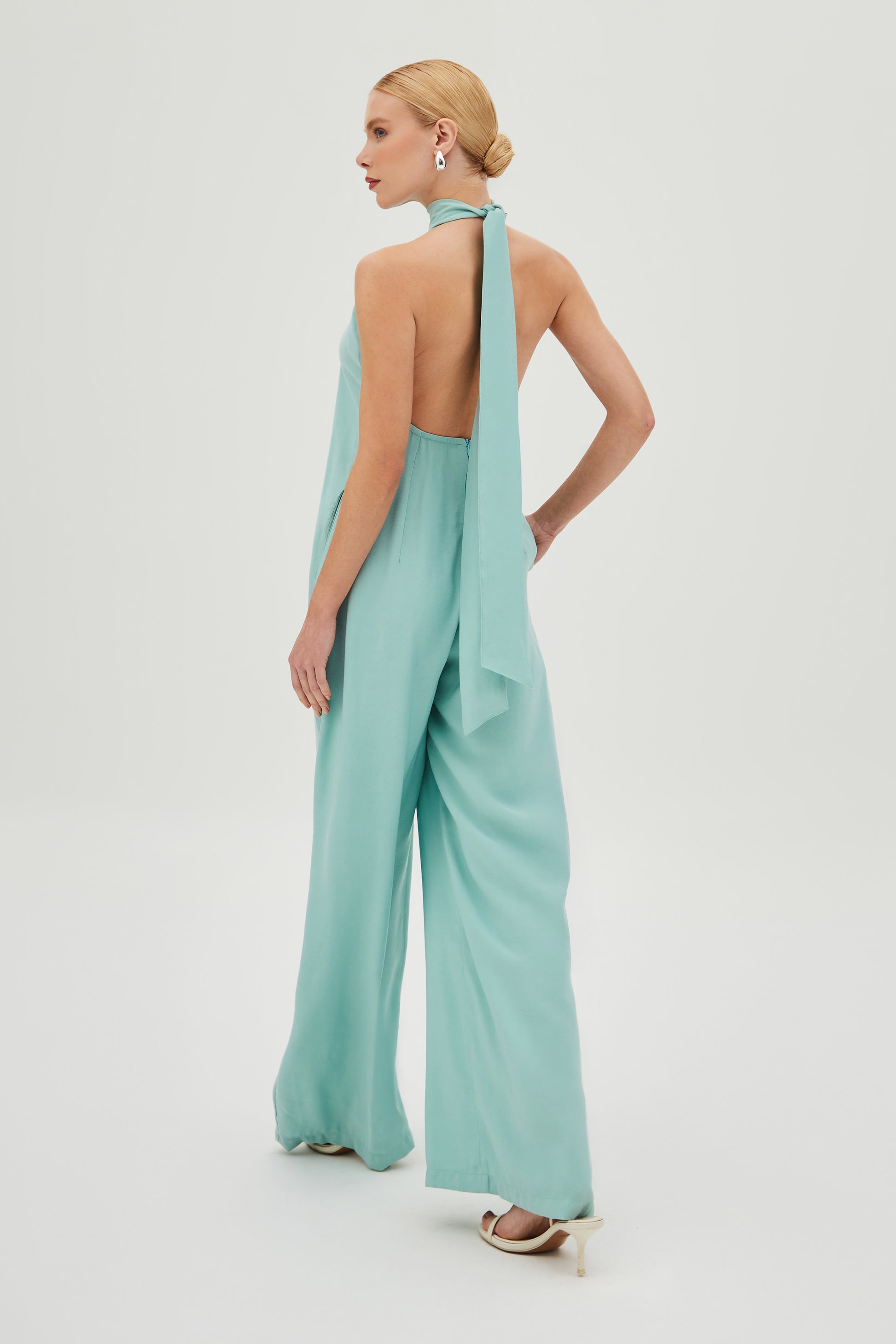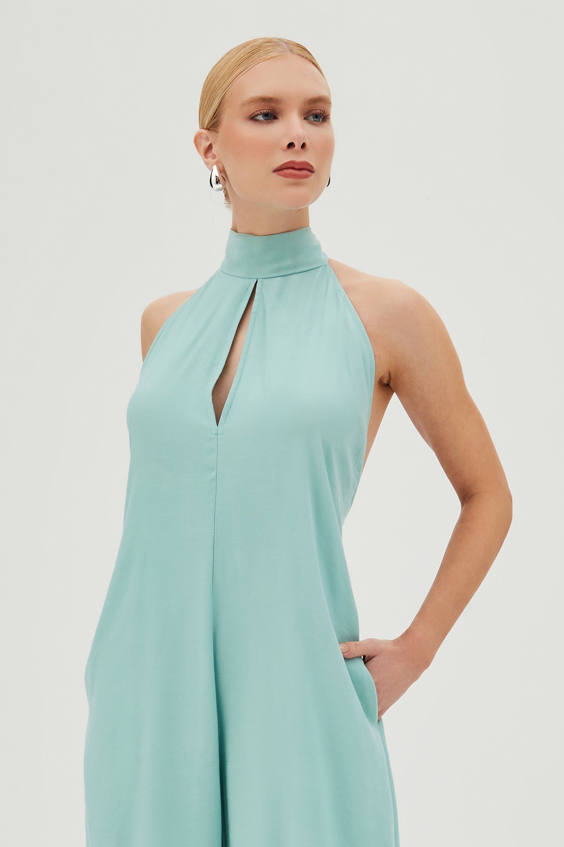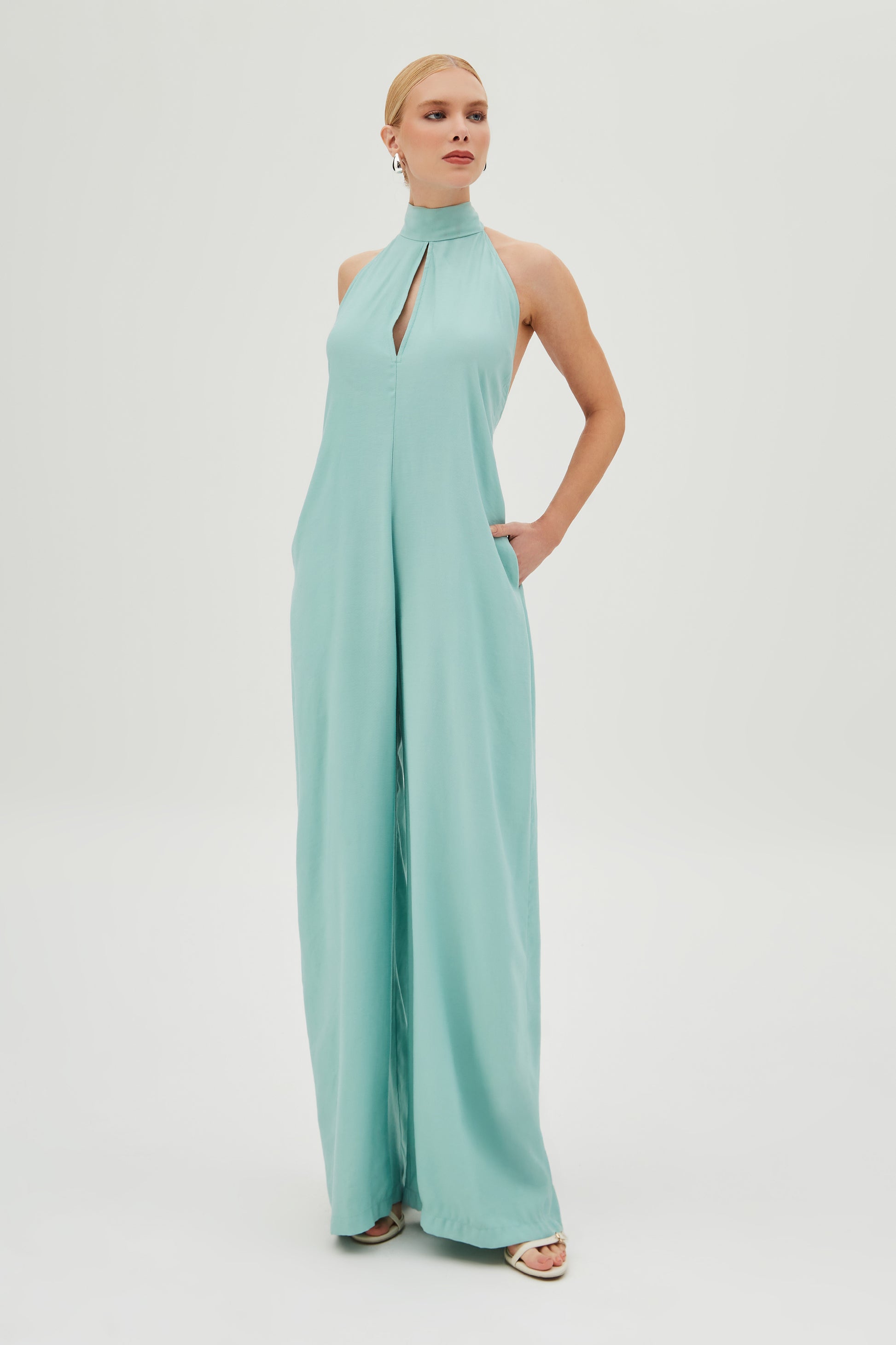 Macacão frente unica confeccionado em Viscose Lyocell na cor Verde Mint. A peça possui modelagem reta, caimento acenturado, gola alta, abertura meio busto, fechamento por amarracao no pescoco e bolsos laterais.