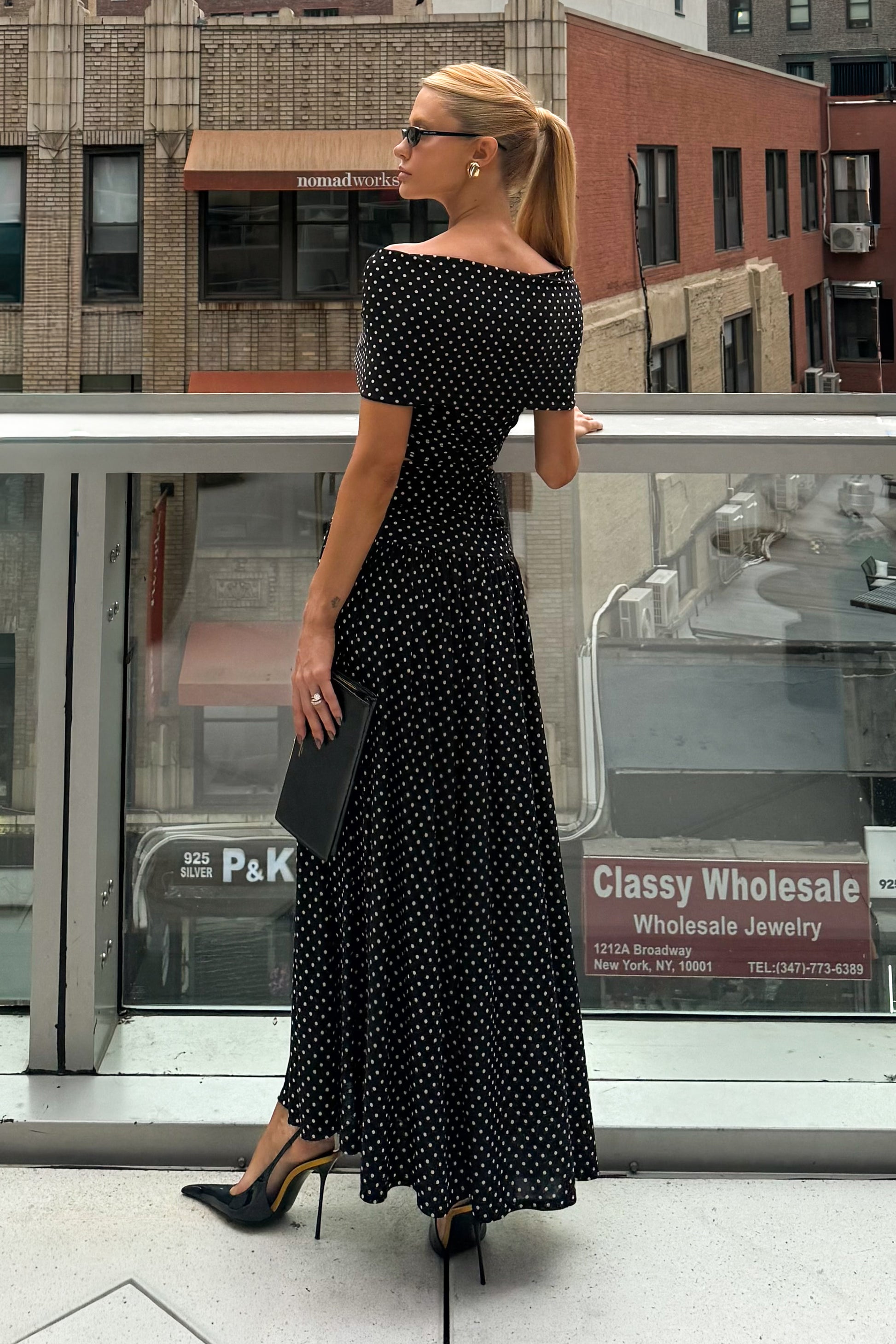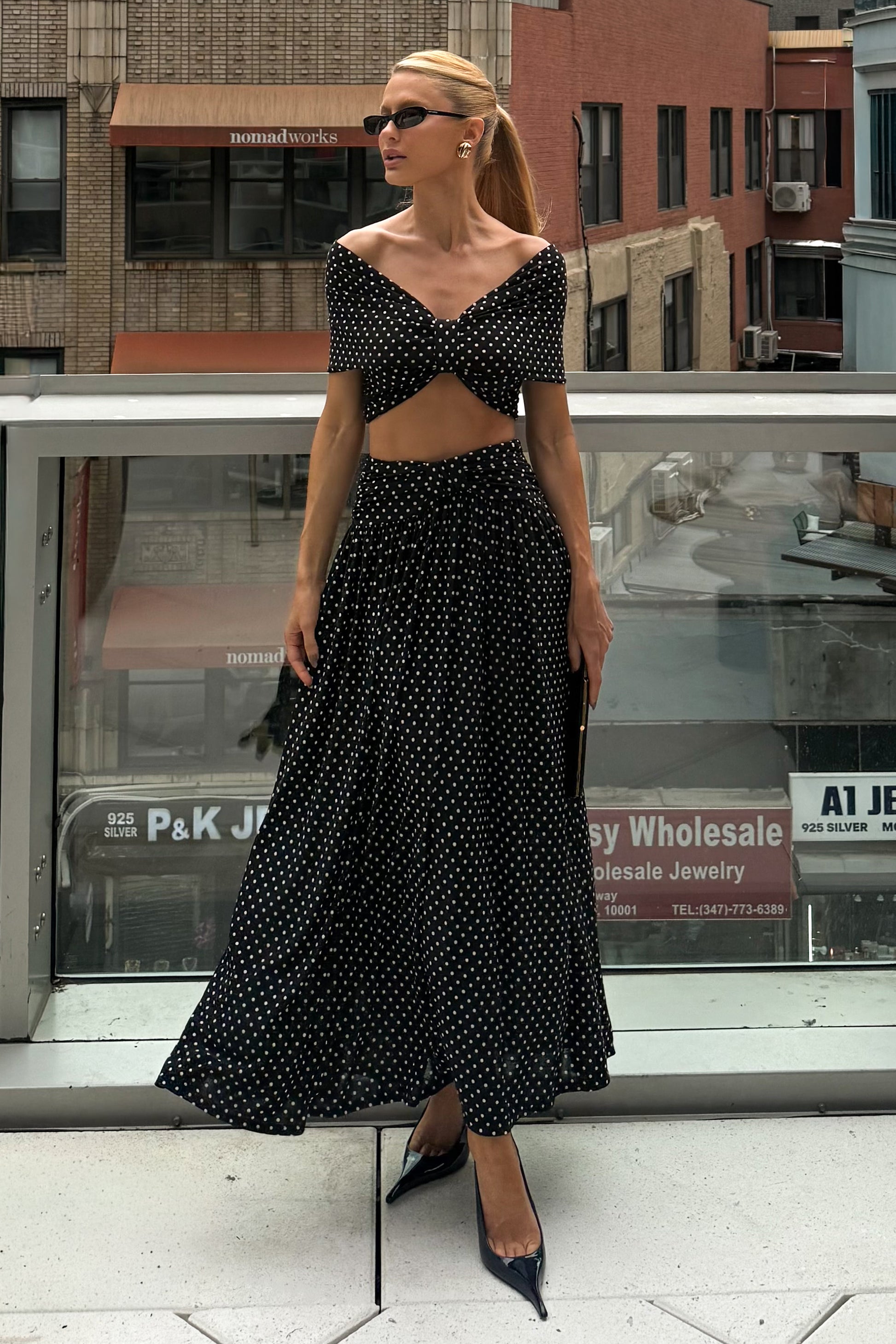 SAIA MIDI AMPLA COS LARGO COM DETALHE POÁ PRETO COM BRANCO