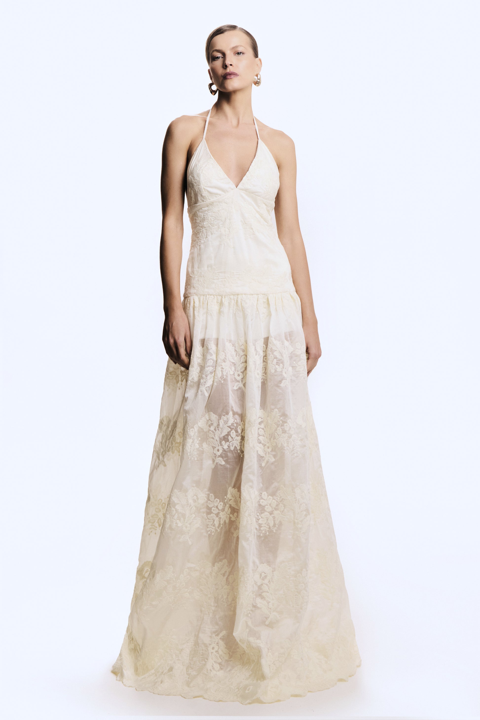 VESTIDO LONGO EM TULE BORDADO FRENTE ÚNICA CREME
