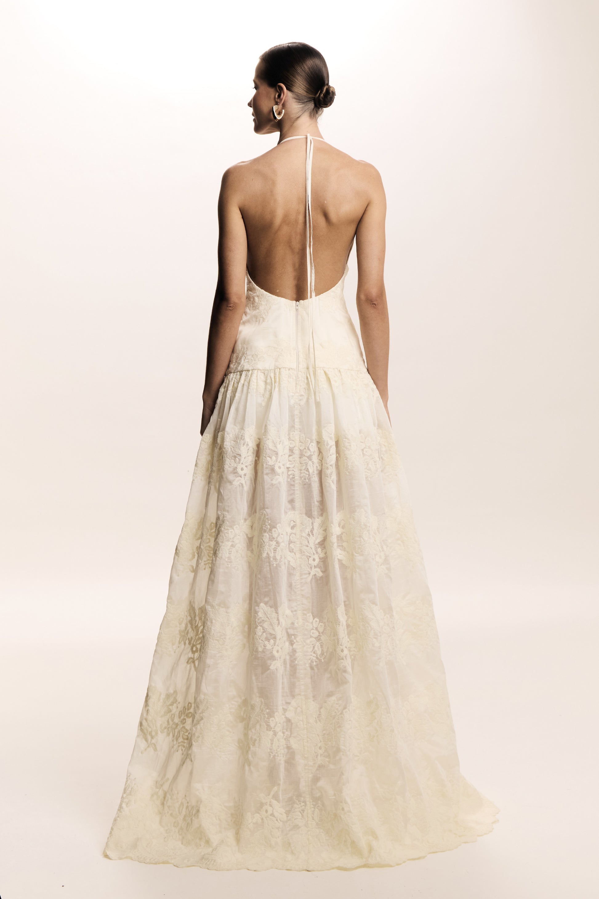 VESTIDO LONGO BORDADO COM RECORTE BUSTO ACINTURADO CREME