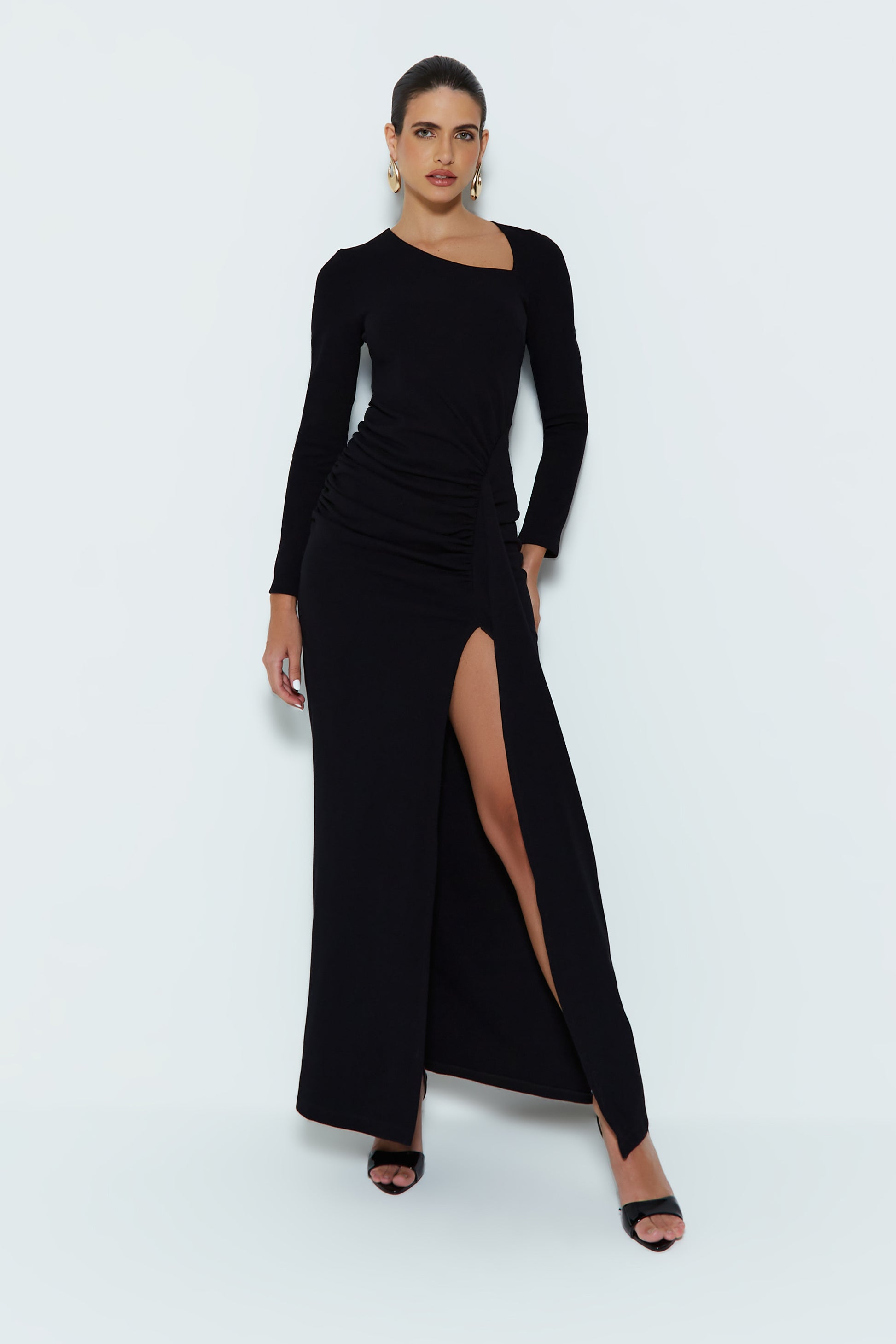 Vestido em malha viscose na cor Preto exclusiva da marca. A peça possui comprimento longo, caimento ajustado no corpo, decote assimétrico, mangas longas, detalhe de drapeados laterais e fenda. Fechamento por zíper nas costas.