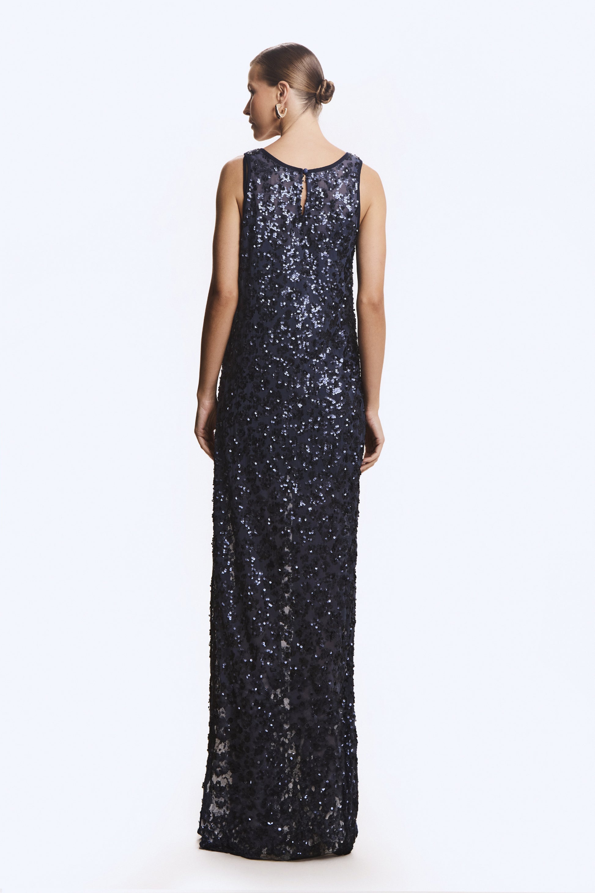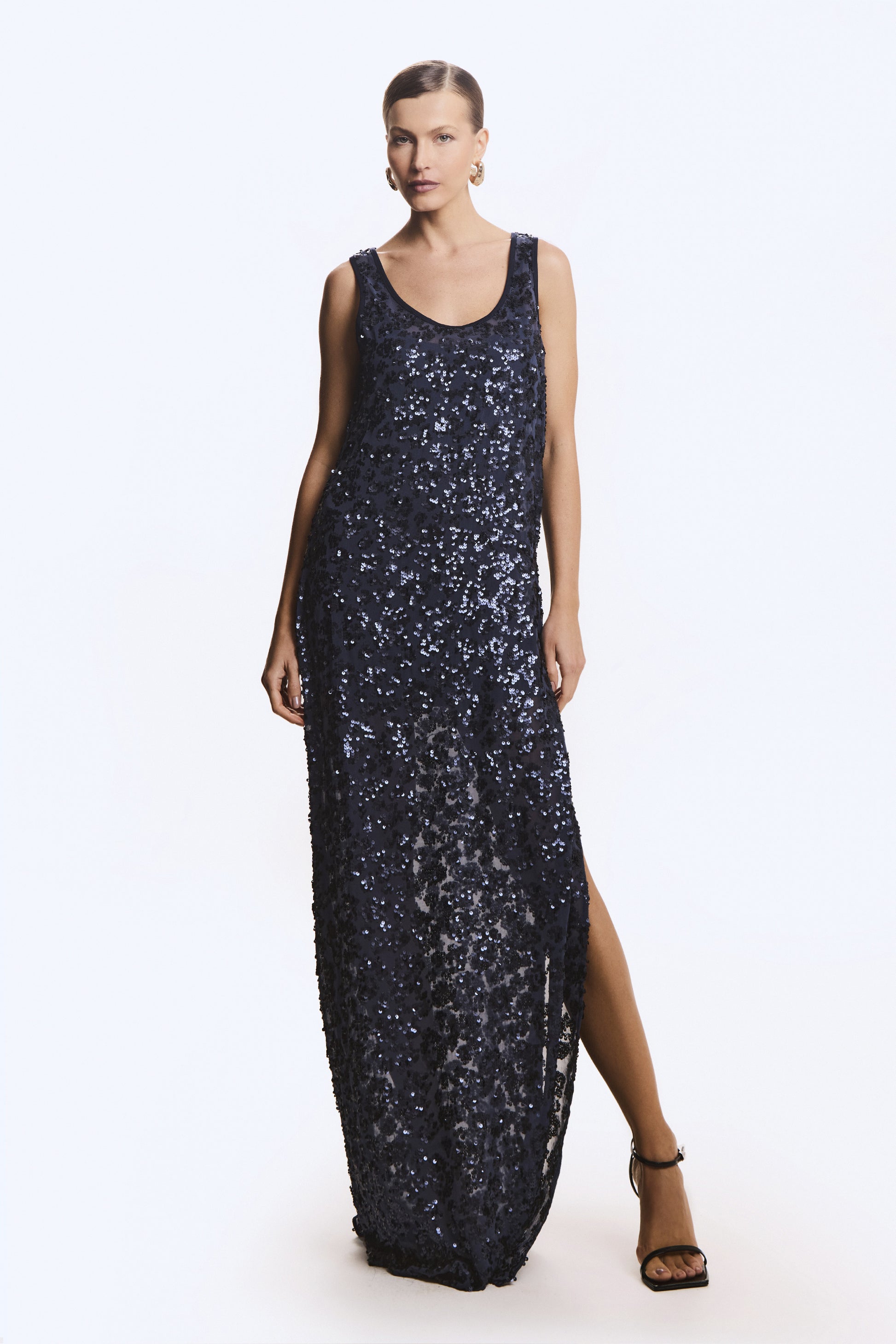 VESTIDO LONGO RETO COM FENDA LATERAL EM PAETE AZUL MARINHO