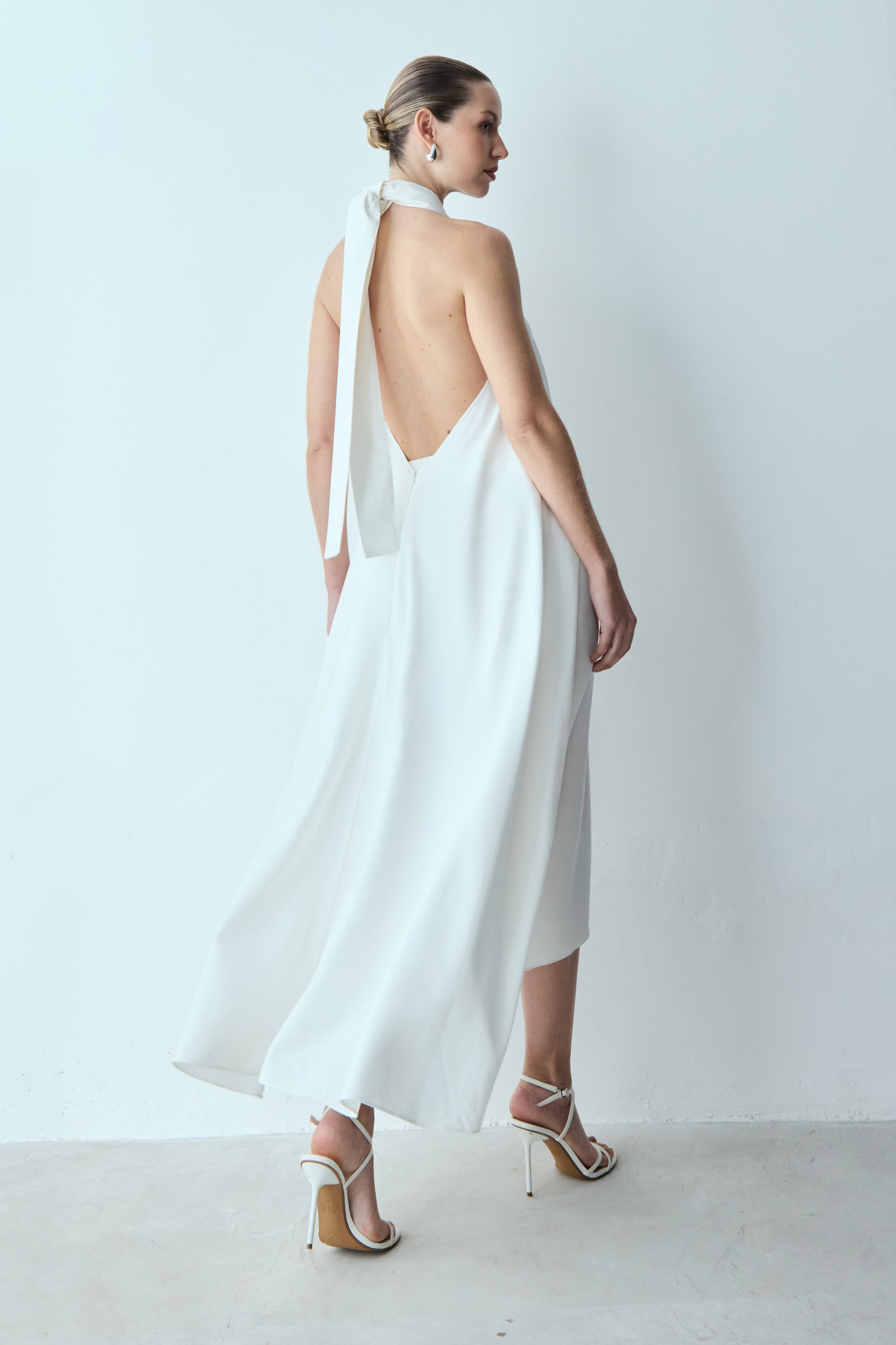 Tunica confeccionada em Viscose Lyocell na cor Off White. Peça fluida e ampla ao corpo, com ajuste por amarração no pescoço e fechamento por zíper invisível nas costas.