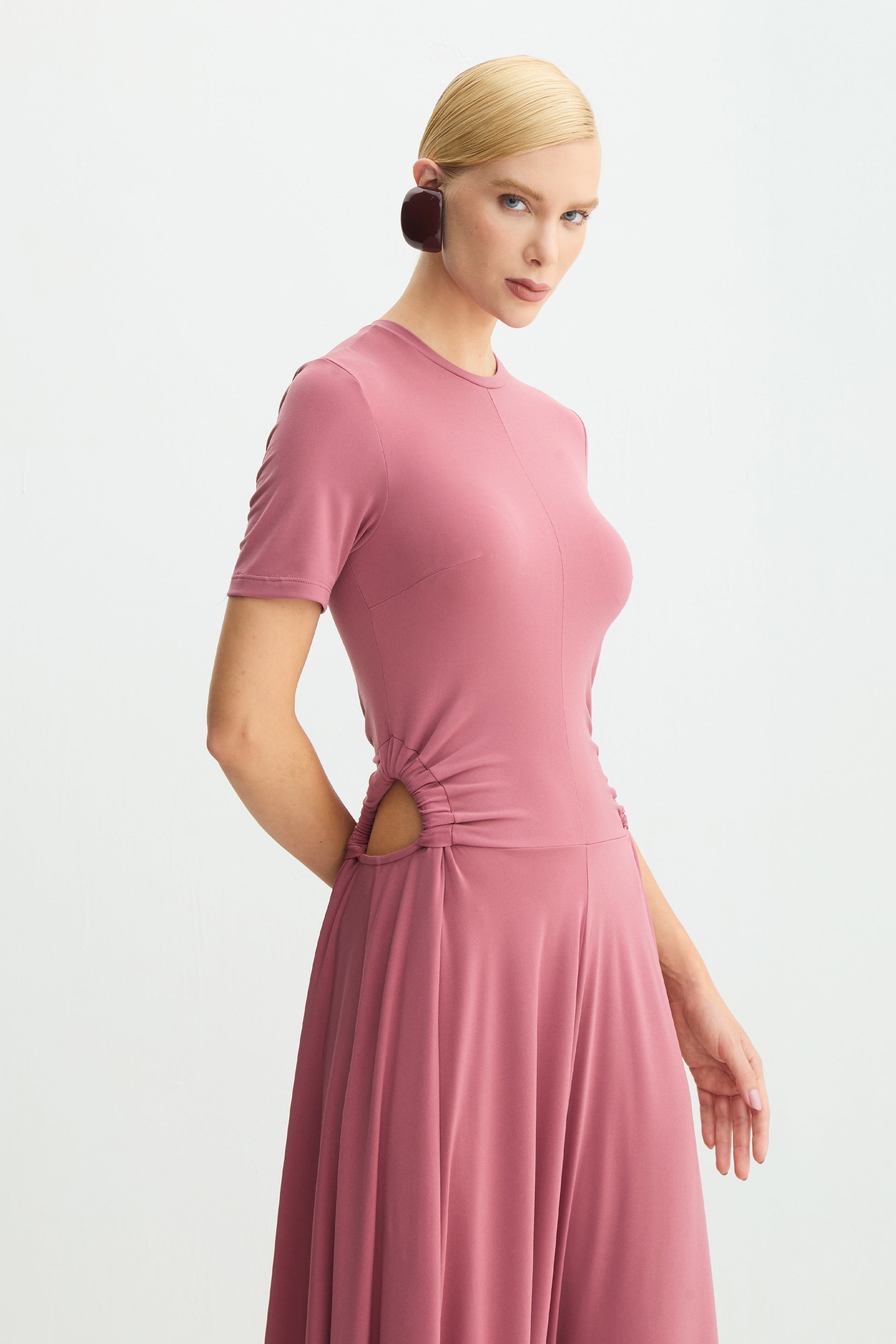 Vestido Midi alongado com abertura lateral e delicados franzidos, que valorizam a silhueta com elegância e fluidez. Confeccionado em Ity, oferece caimento impecável, toque macio e conforto absoluto. Uma peça versátil e sofisticada, perfeita para composições modernas .