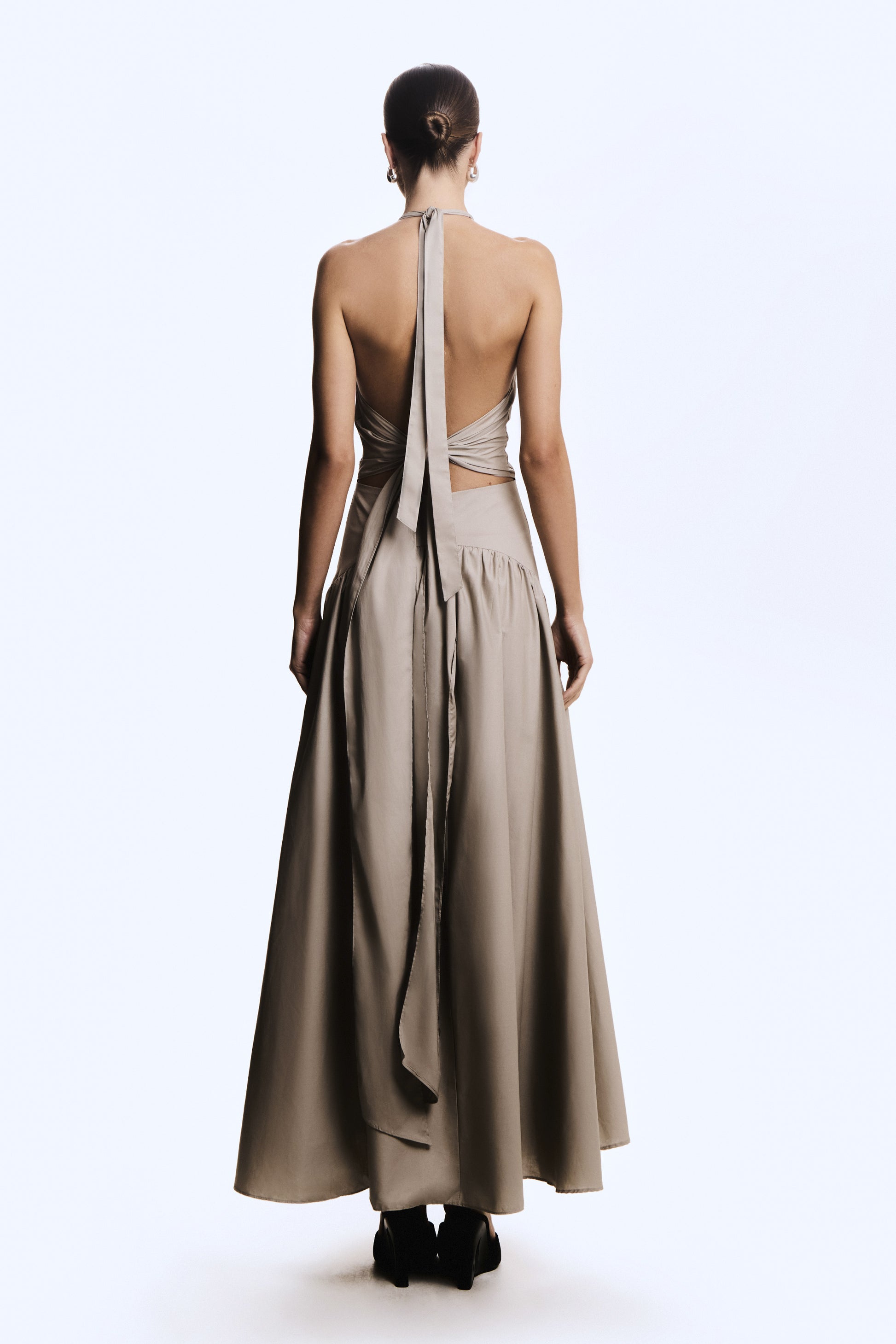 VESTIDO MIDI AMARRACAO COSTAS E PESCOCO BARRA AMPLA PRETO BEGE SAFARI