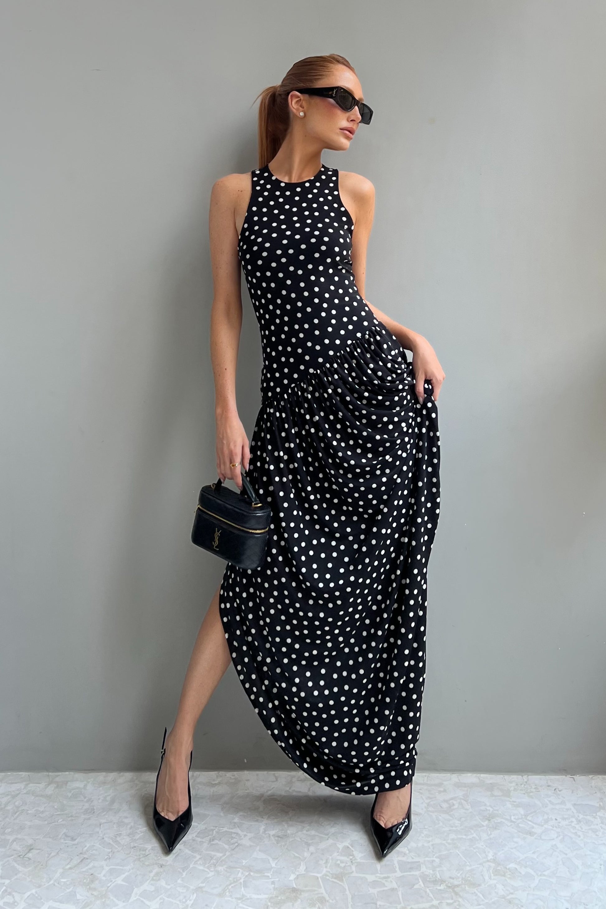 VESTIDO MIDI BARRA BALONE FLUIDA E ASSIMETRICA PRETO