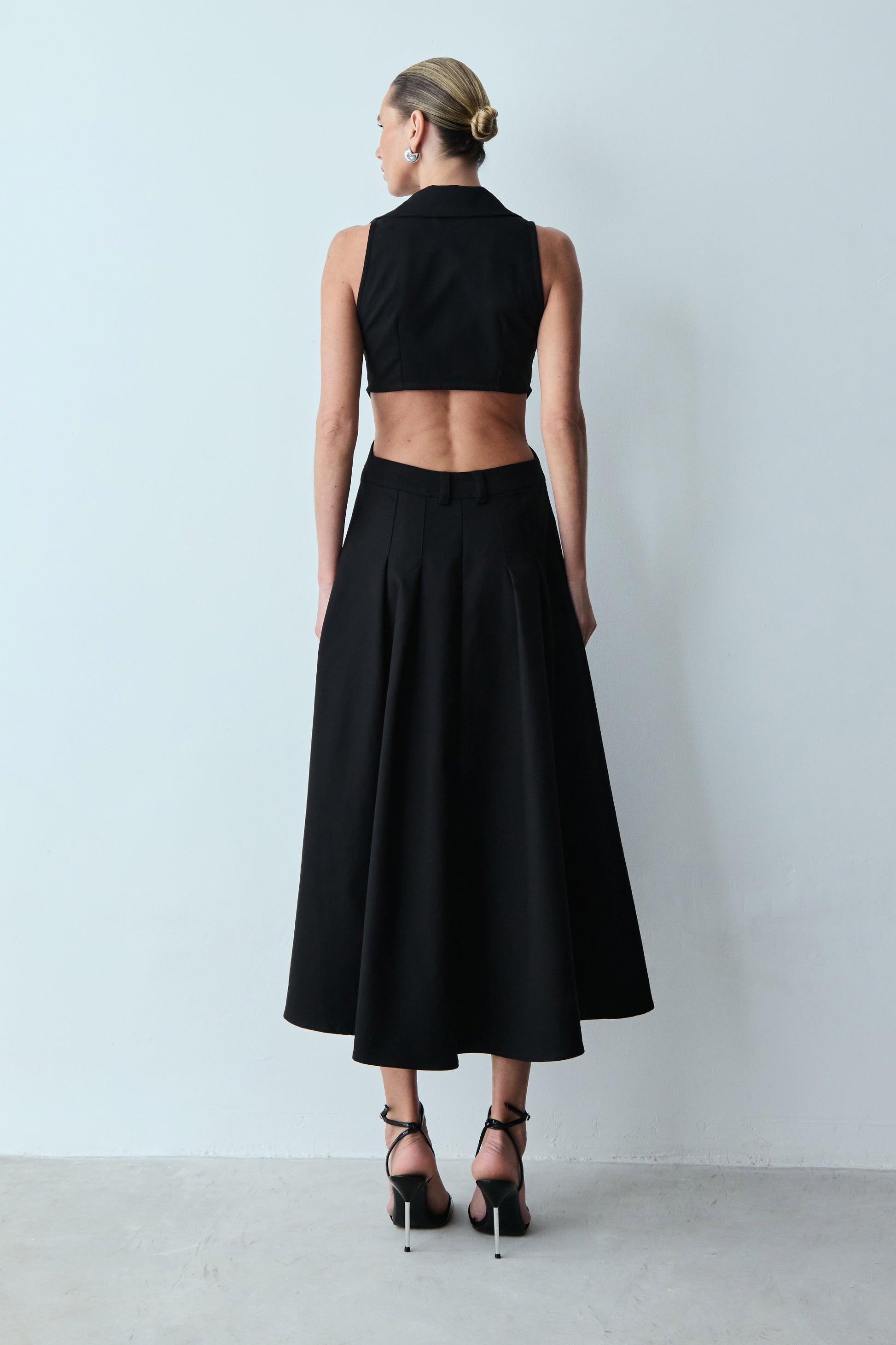 Vestido confeccionado em Compact Cotton na cor Preto. A peça possui comprimento midi, caimento leve e acinturado, abertura costas, bolso assimetrico, abotoamento frontal, decote em V e pregas na saia e passante para cinto.