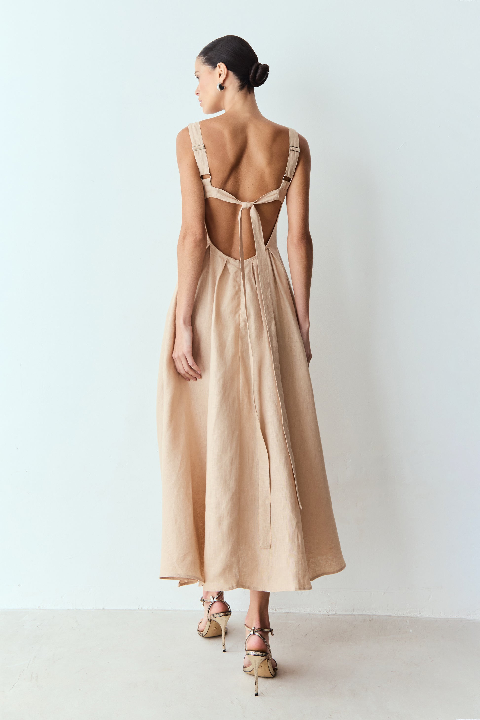 VESTIDO MIDI COM PREGAS COSTAS ABERTAS E AMARRACAO KAKI CLARO