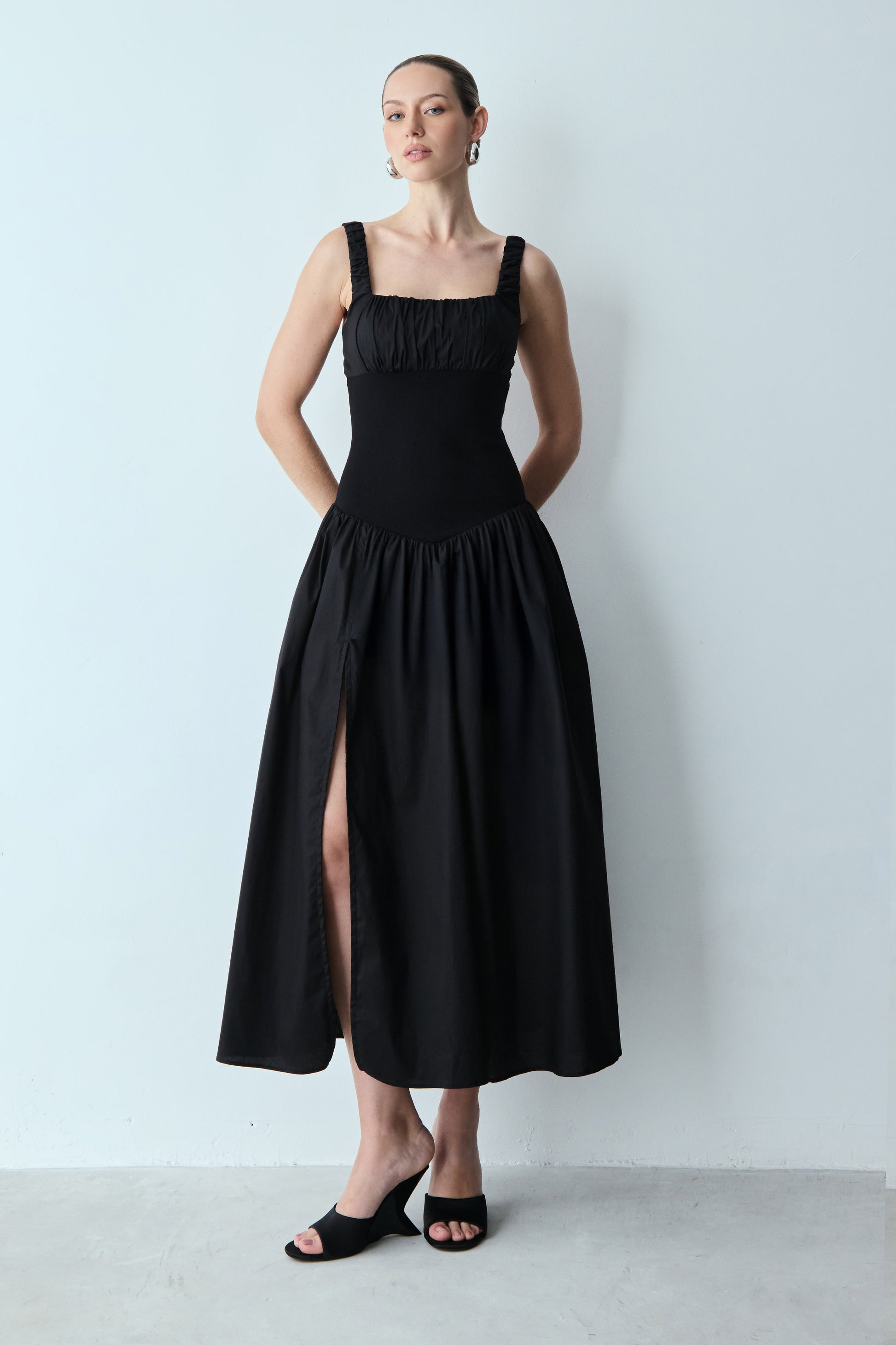 VESTIDO MIDI DECOTE RETO COM FRANZIDOS BUSTO E ALÇAS PRETO