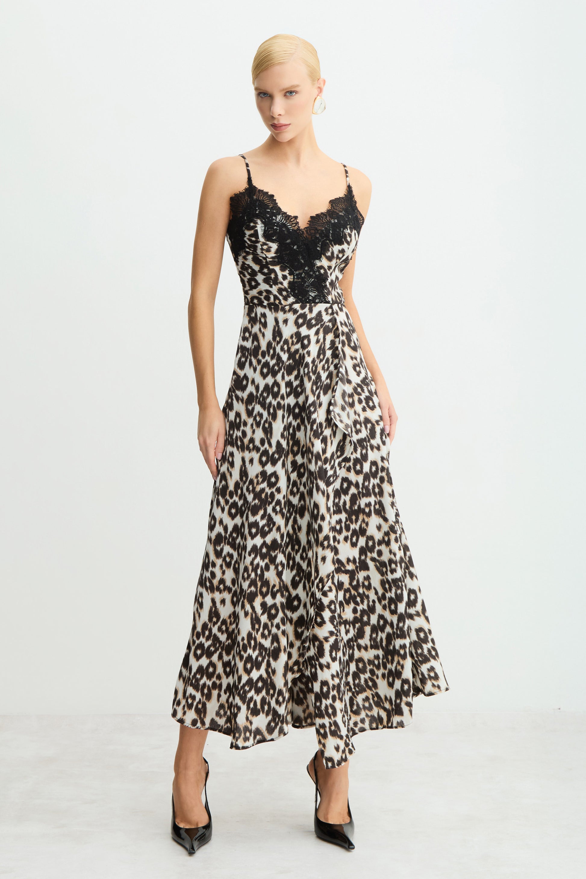 Com personalidade e elegância na medida certa, o Vestido Midi traz decote V valorizado por renda delicada no busto, criando um contraste sofisticado com a estampa onça. A modelagem fluida confeccionado em Crepe garante movimento e leveza, enquanto o comprimento Midi equilibra sensualidade e refinamento. Uma peça marcante para produções que pedem atitude e charme.