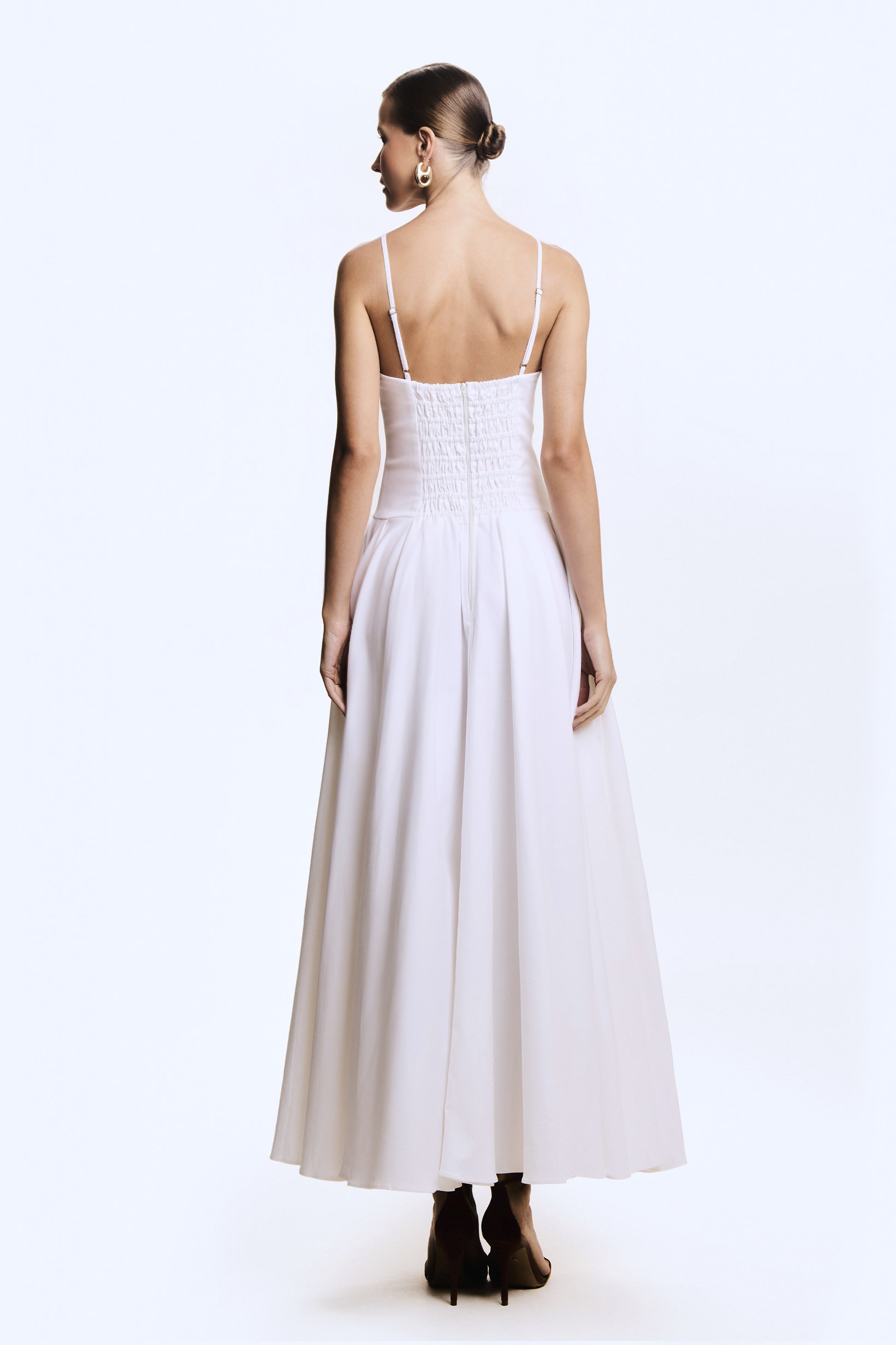 Elegante e atemporal, este vestido midi estruturado traz um visual sofisticado com leveza e feminilidade. O modelo possui busto com recorte que valoriza o colo com delicadeza, além de alças finas que reforçam sua estética clássica. A saia com pregas acrescenta movimento e volume na medida certa, criando um caimento impecável, perfeito para ocasiões que pedem charme e presença. Um vestido que combina modernidade e estilo, confeccionado em Compact Cotton é ideal para quem busca uma peça marcante e versátil para acompanhar diferentes momentos com elegância.