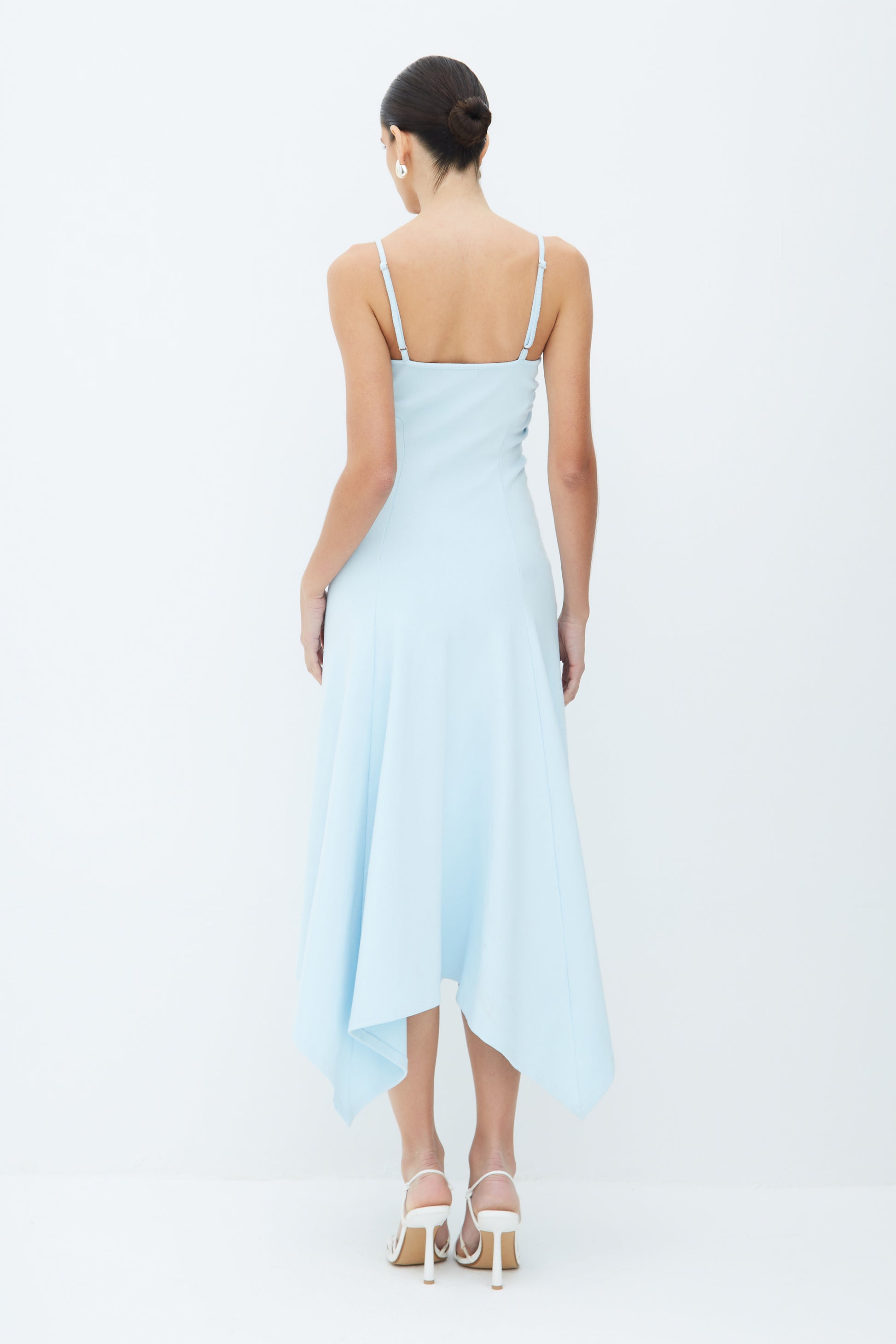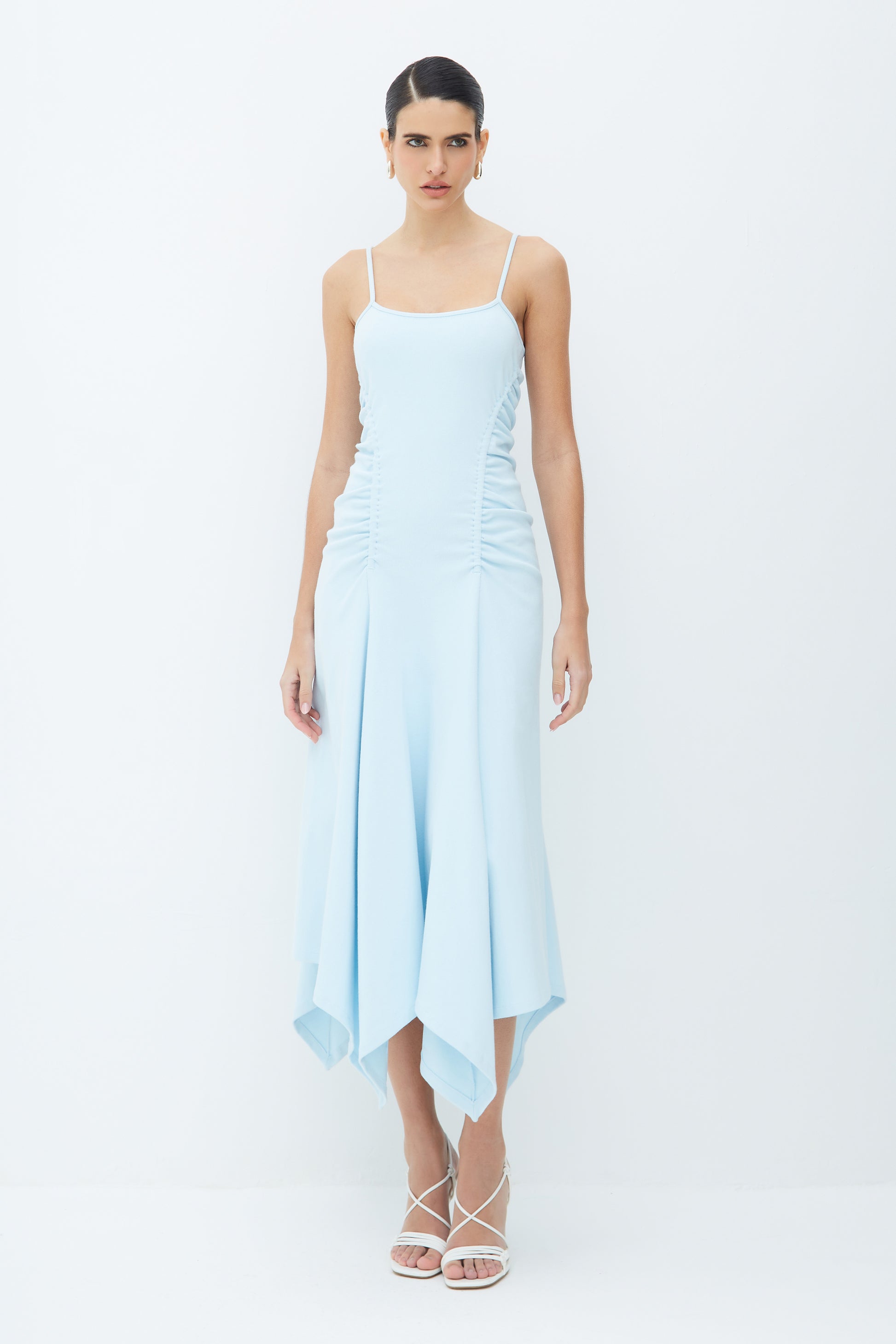 Vestido confeccionado em Malha de Viscose na cor Azul Polar. A peça possui comprimento midi, caimento ajustado ao corpo, franzido lateral, barra assimétrica, alça ajustável.