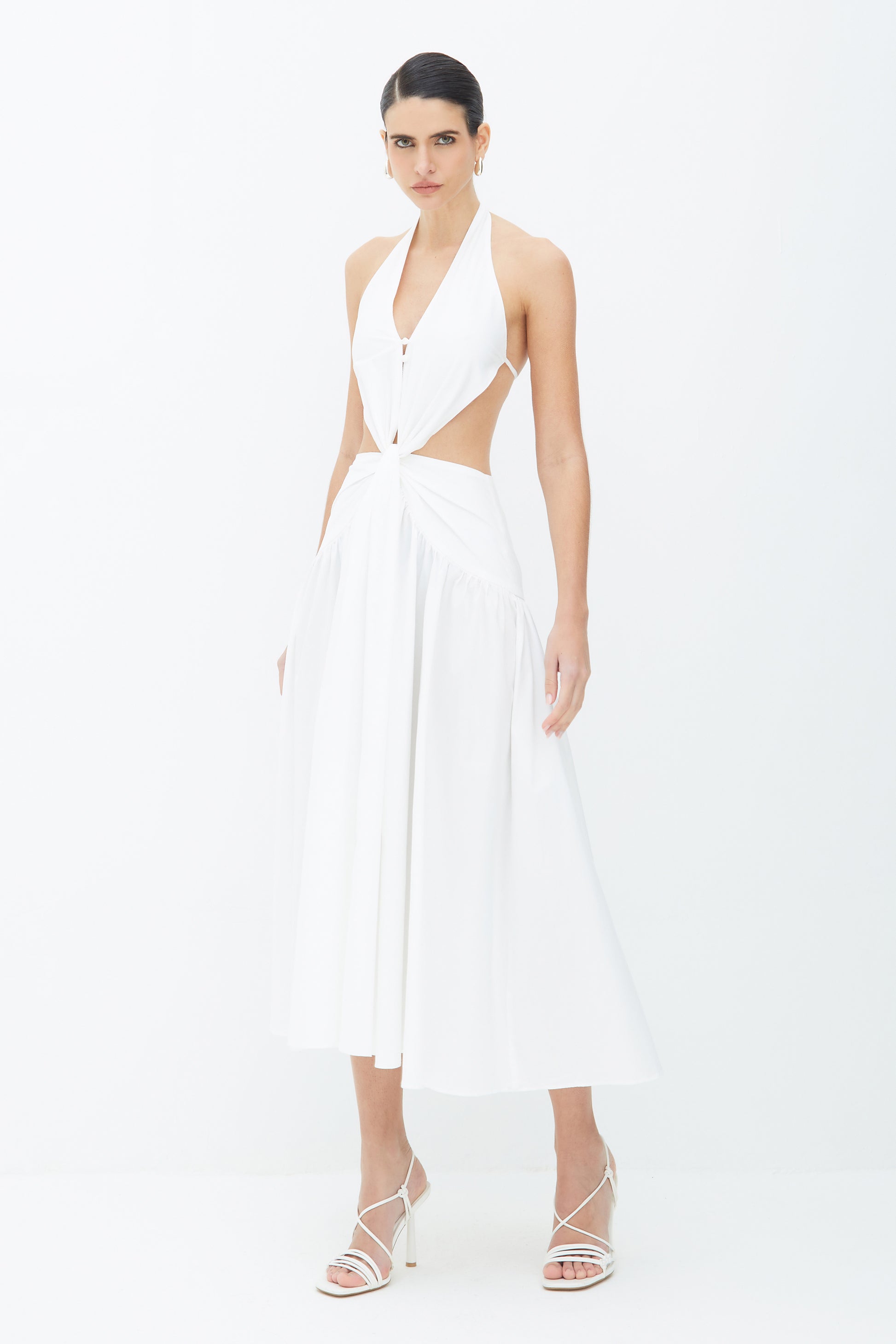 Vestido confeccionado em Tricoline na cor Off White. A peça possui comprimento midi, frente única, com saia ampla e corpo ajustado por amarração pescoço e costas. Contem uma torção frontal e dois botões forrados no decote, fechamento por zíper invisível nas costas.
