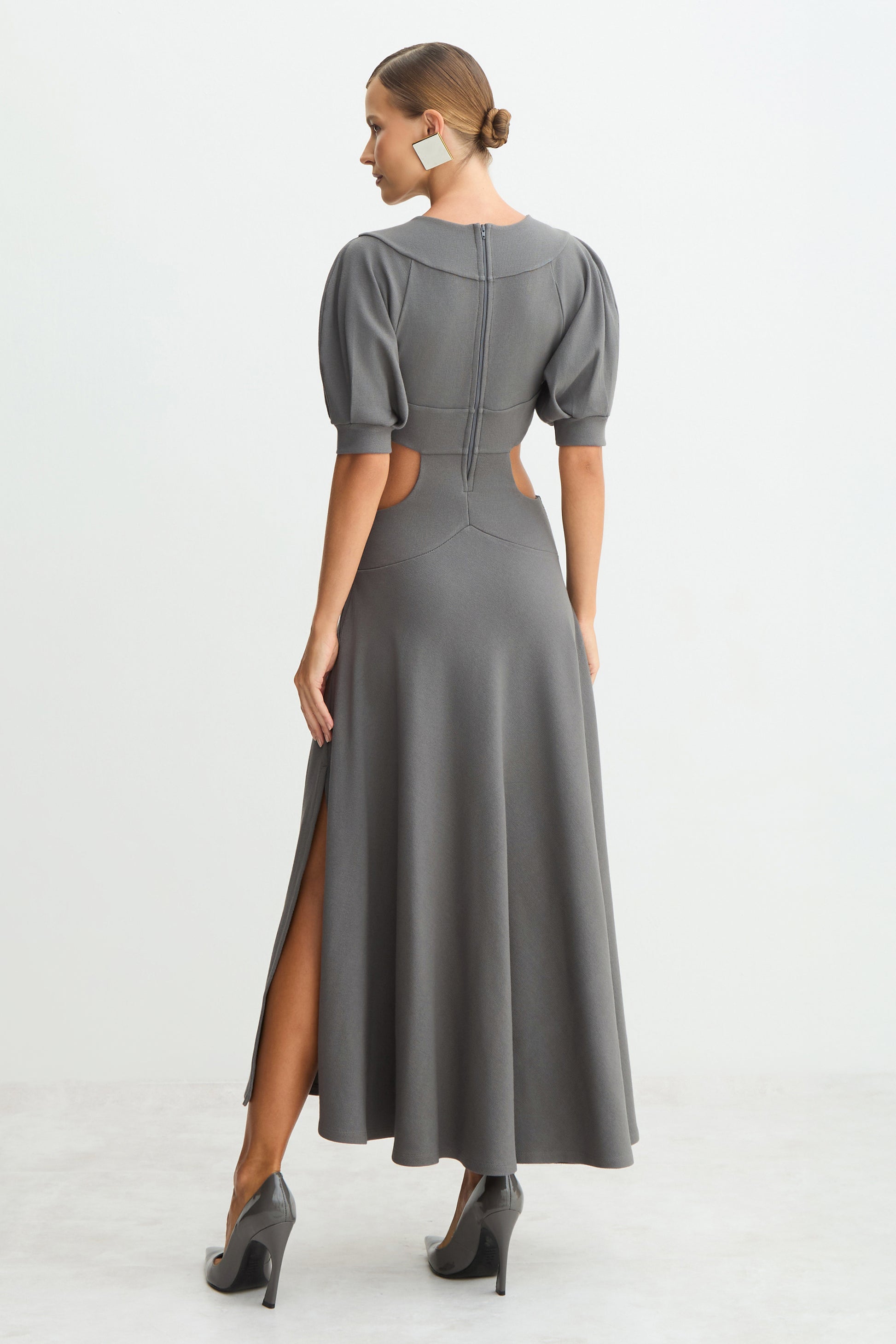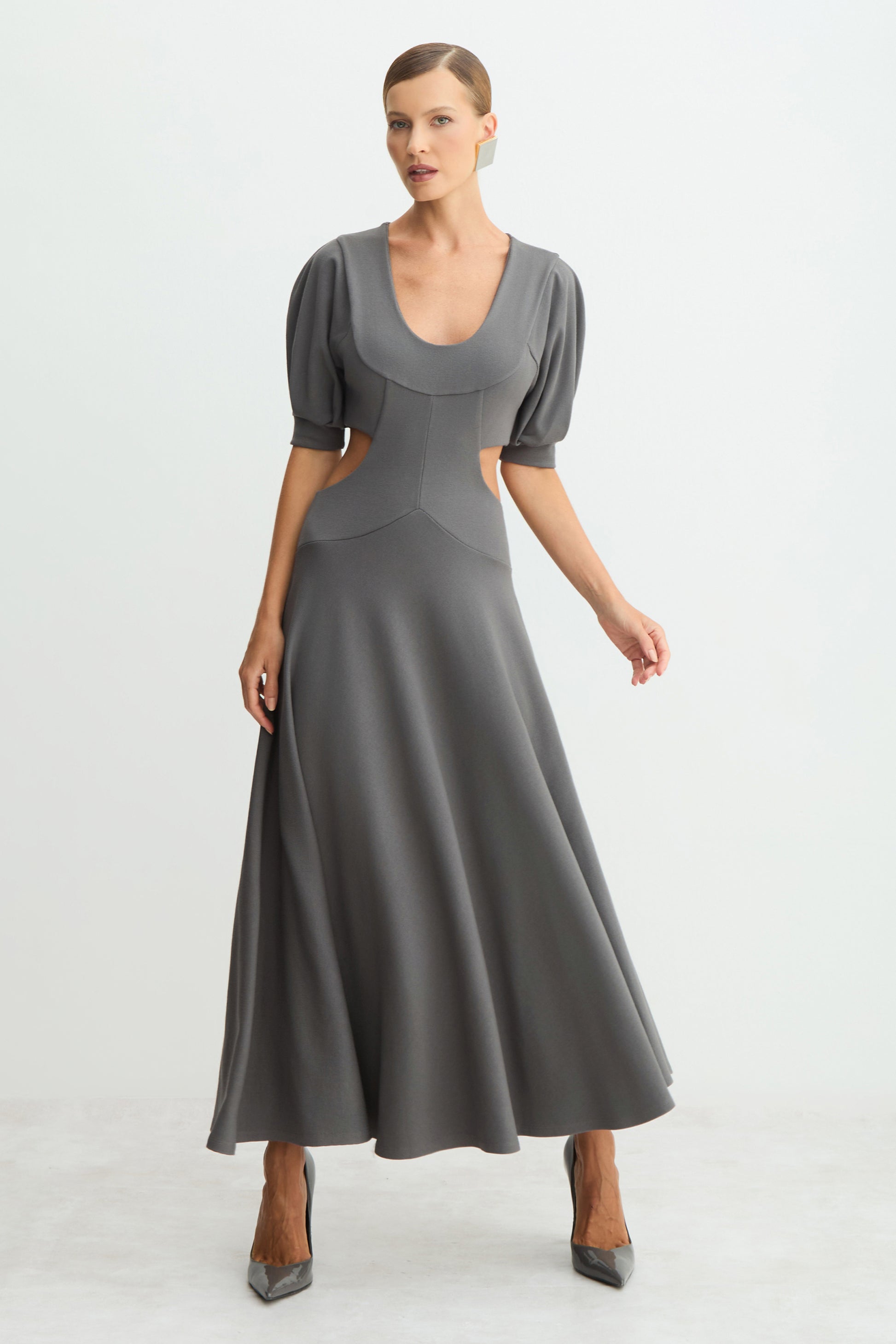 VESTIDO MIDI MANGAS CURTAS AMPLAS ABERTURAS LATERAIS CINZA
