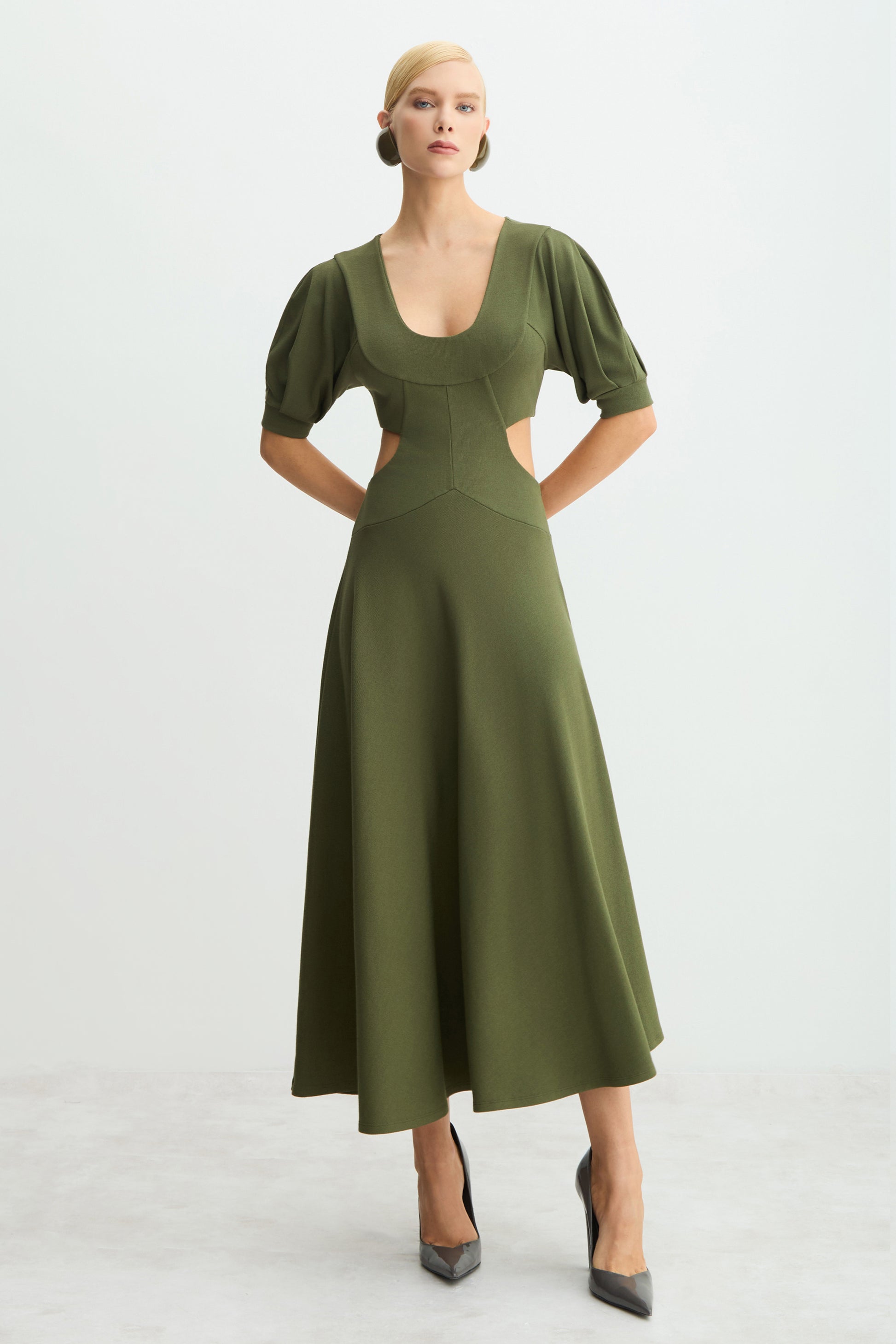 VESTIDO MIDI MANGAS CURTAS AMPLAS ABERTURAS LATERAIS VERDE MILITAR
