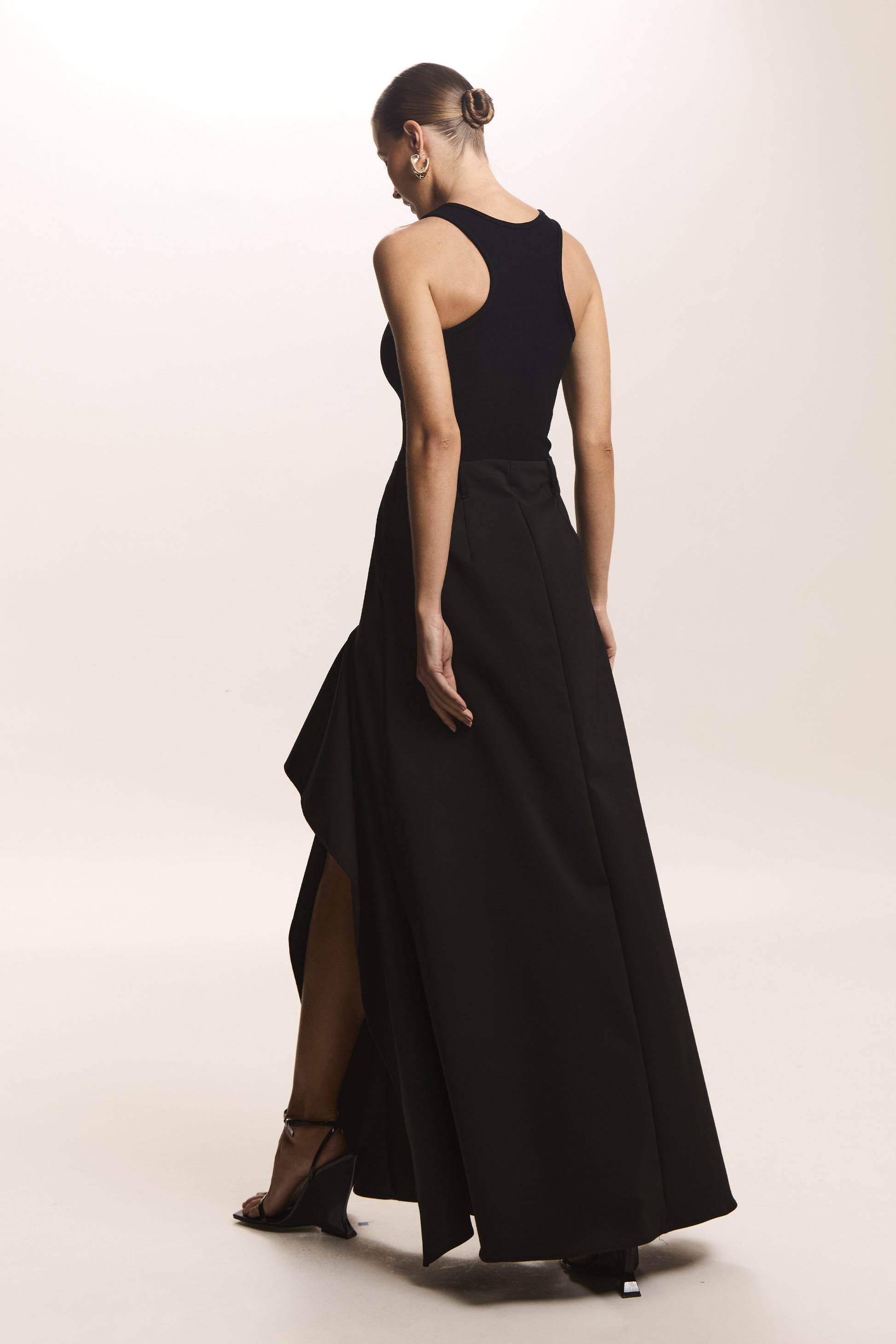 VESTIDO MIDI SAIA ALFAIATARIA COM BABADO ASSIMETRICO PRETO