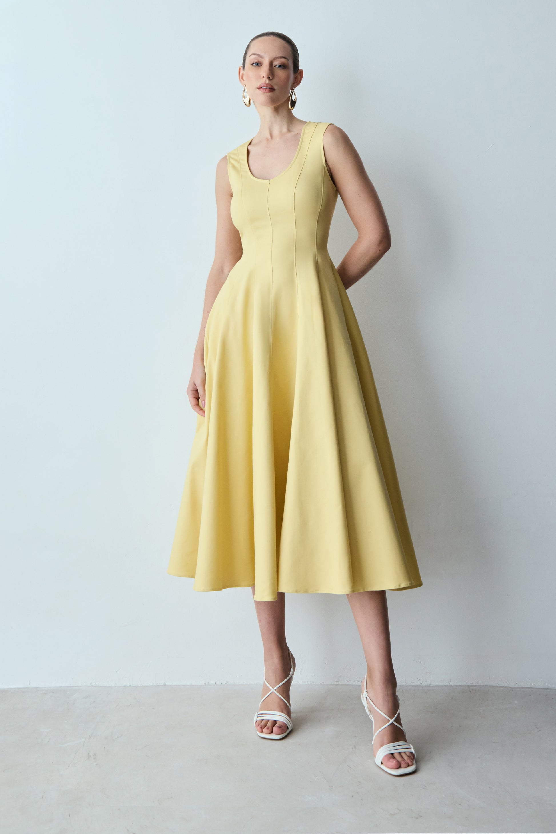 VESTIDO MIDI SAIA GODE COM RECORTES FRONTAL AMARELO MANTEIGA