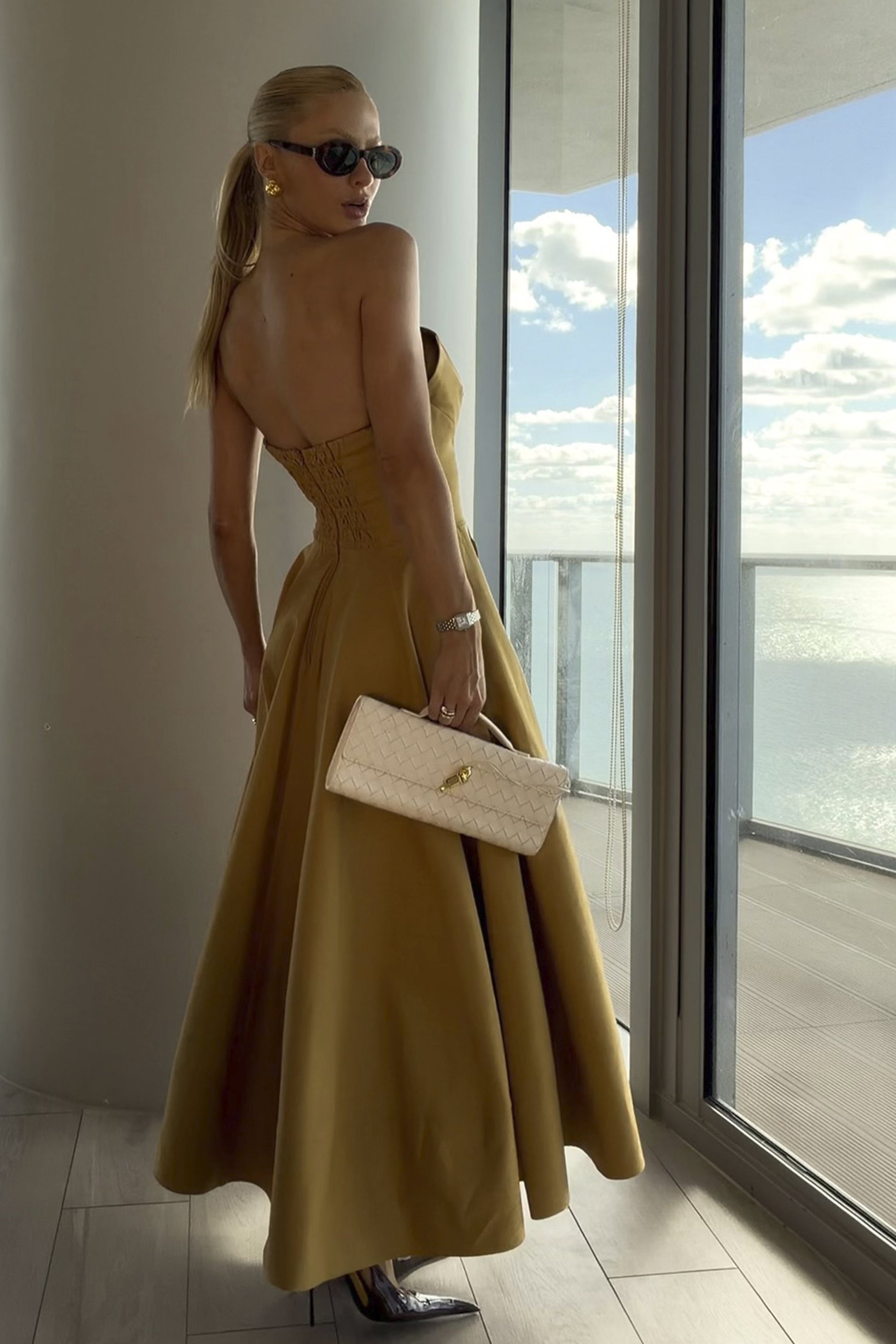 VESTIDO MIDI SOBREPOSICAOO ESTRUTURADA BUSTO KAKI MEDIO