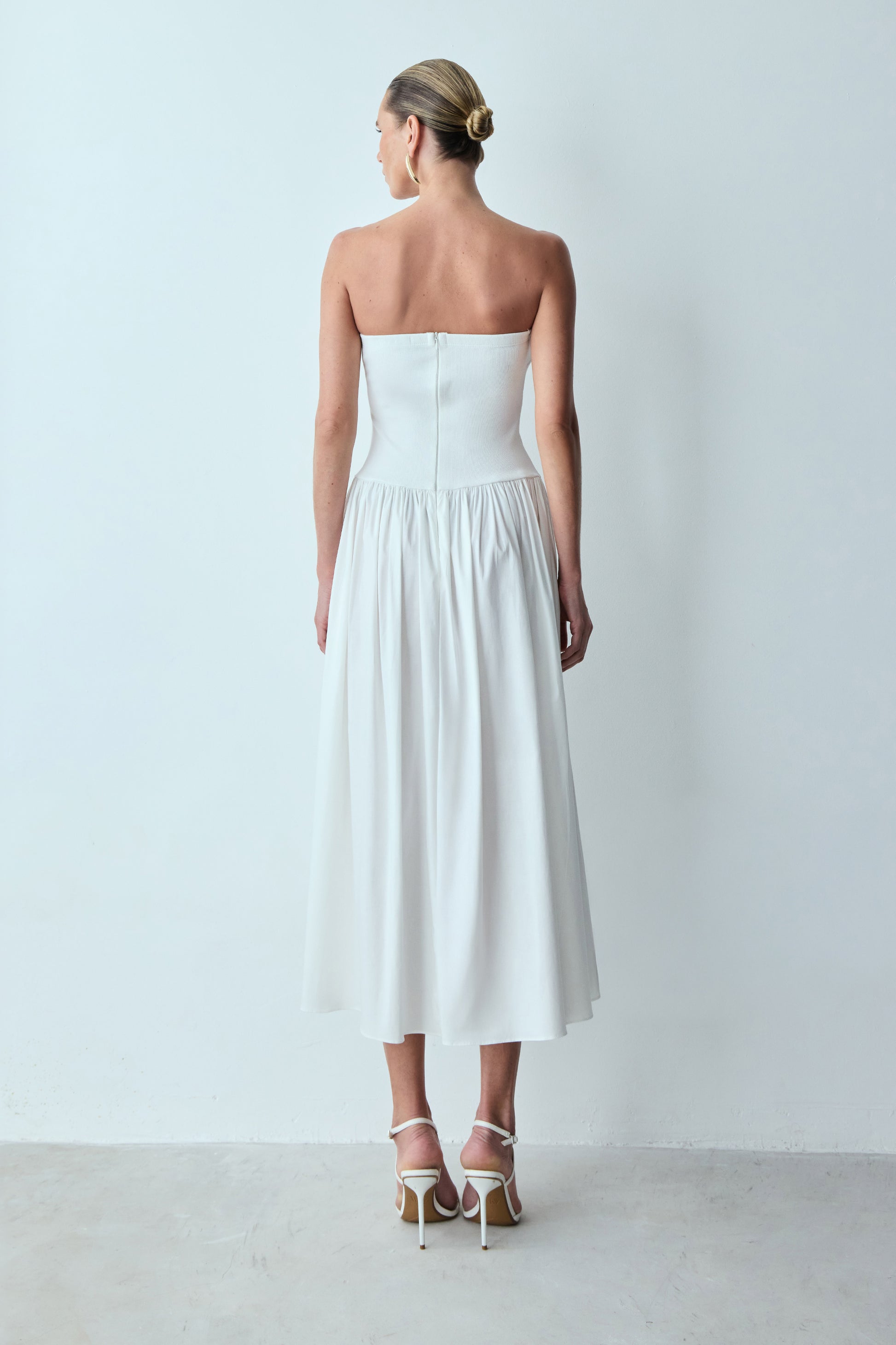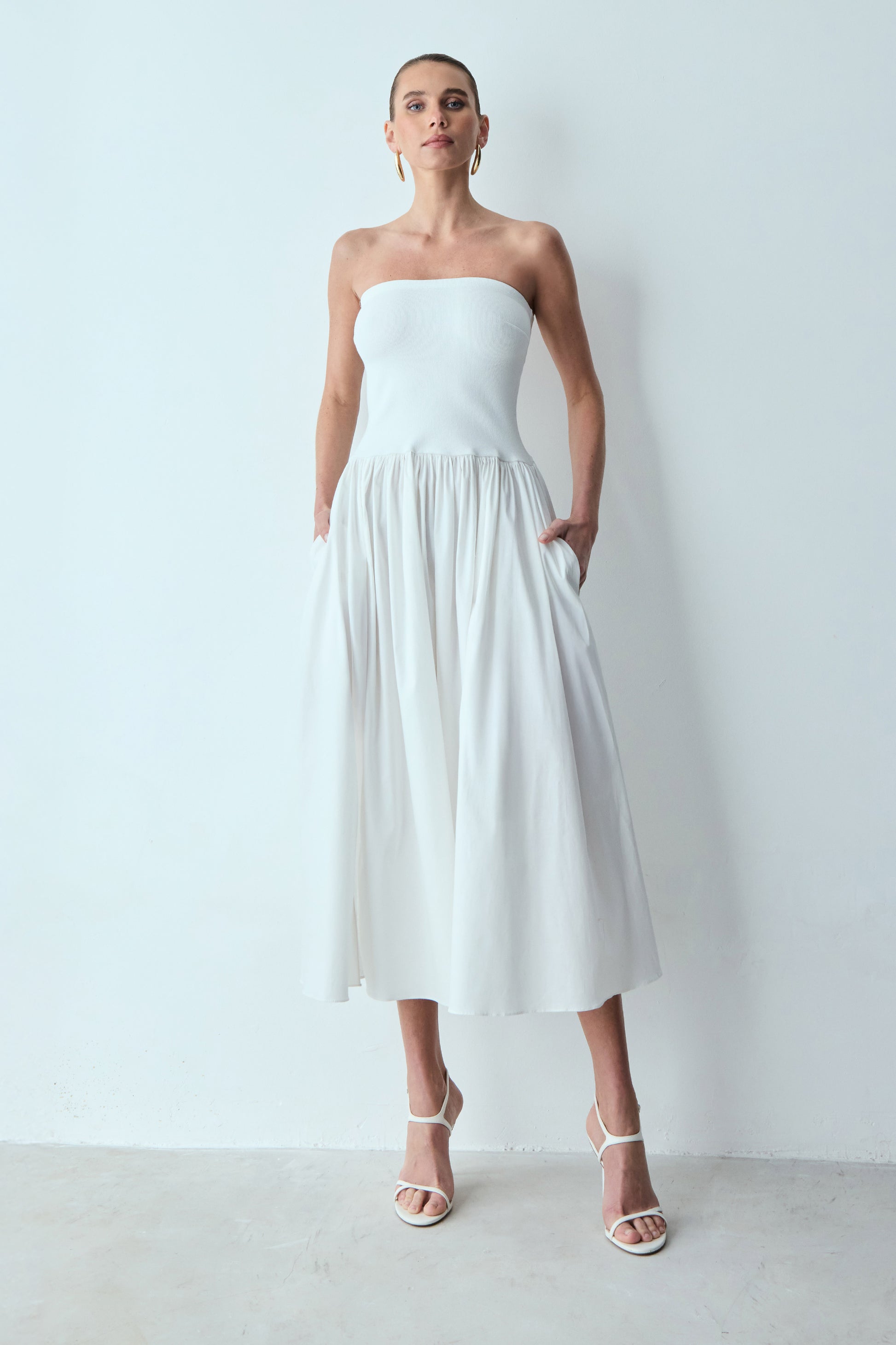 Vestido confeccionado em viscose na parte superior e saia em tricoline na cor Off White. A peça possui comprimento midi, caimento ajustado ao corpo, saia ampla, bolsos laterais, fenda frontal e fechamento por zíper invisível.